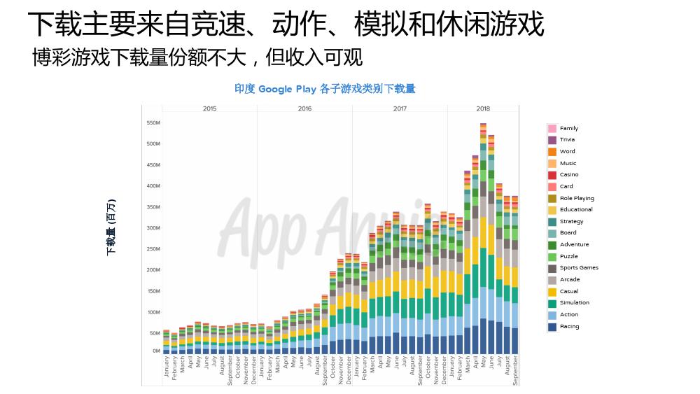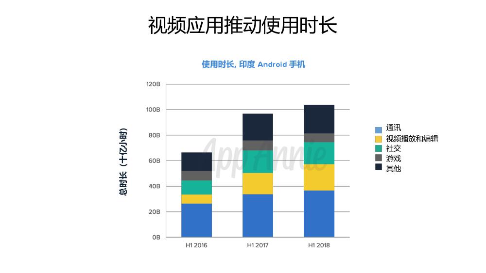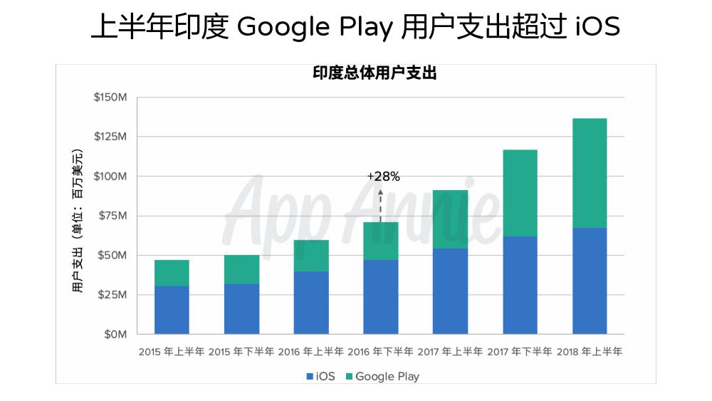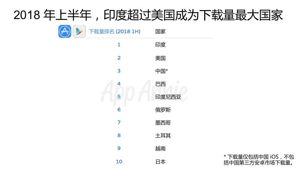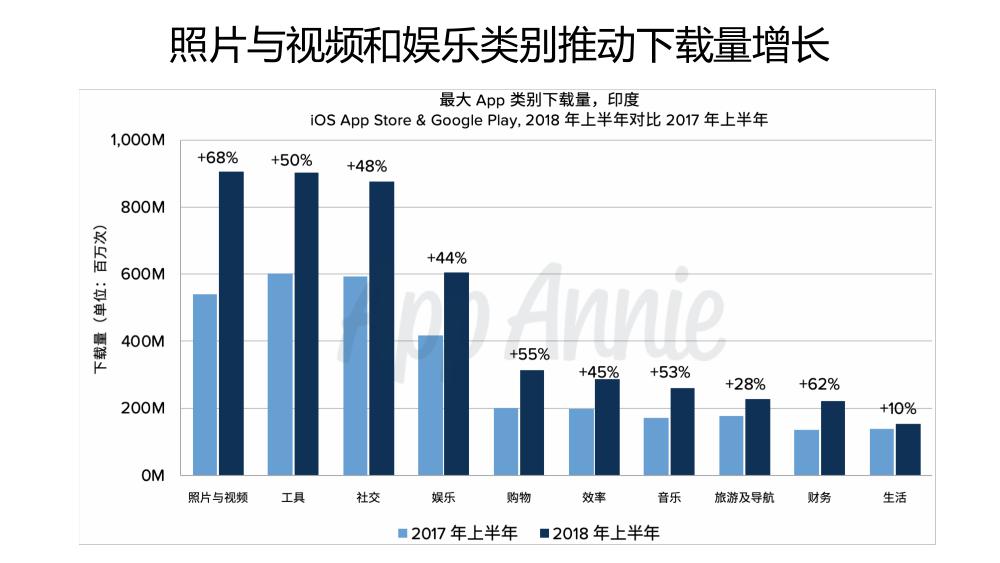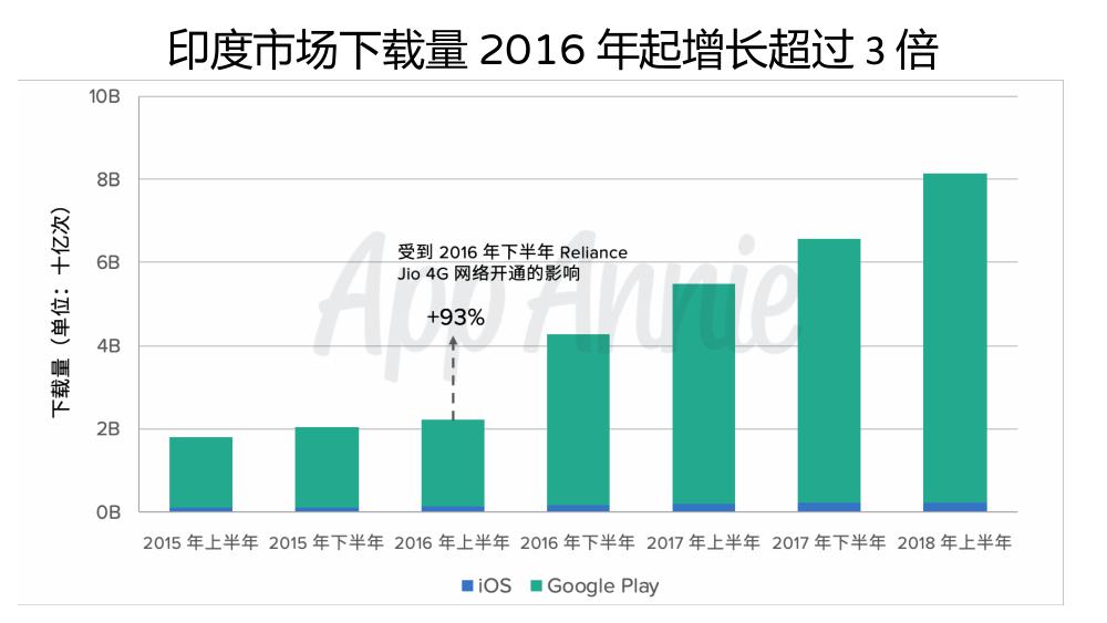 - 根据 App Annie 2018 年上半年统计数据,印度iOS 和 Android 商店下载量综合已经超过了美国。自2016 年上半年 Reliance Jio 4G 网络的开通,印度下载量增长了三倍,Android 下载量占据了绝对优势。主要应用类别中,照片与视频 App 的下载量增长最为迅速,社交和娱乐也紧随其后。