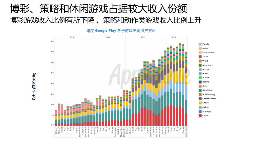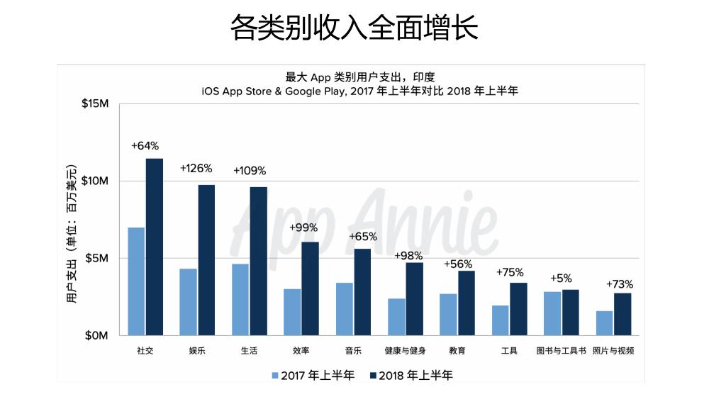 - 印度市场的盈利潜力也在上半年得到了充分的体现。上半年,印度 Google Play 用户支出已经超过iOS,而且各个类别均呈现出显著增长。娱乐类 App 的收入同比增长高达126%,社交类 App 的收入同比增长达64%,生活类 App 收入增长也达到了 109%。从用户使用时长和数据流量消耗来看,视频类应用占据了移动生活中相当重要的一部分。