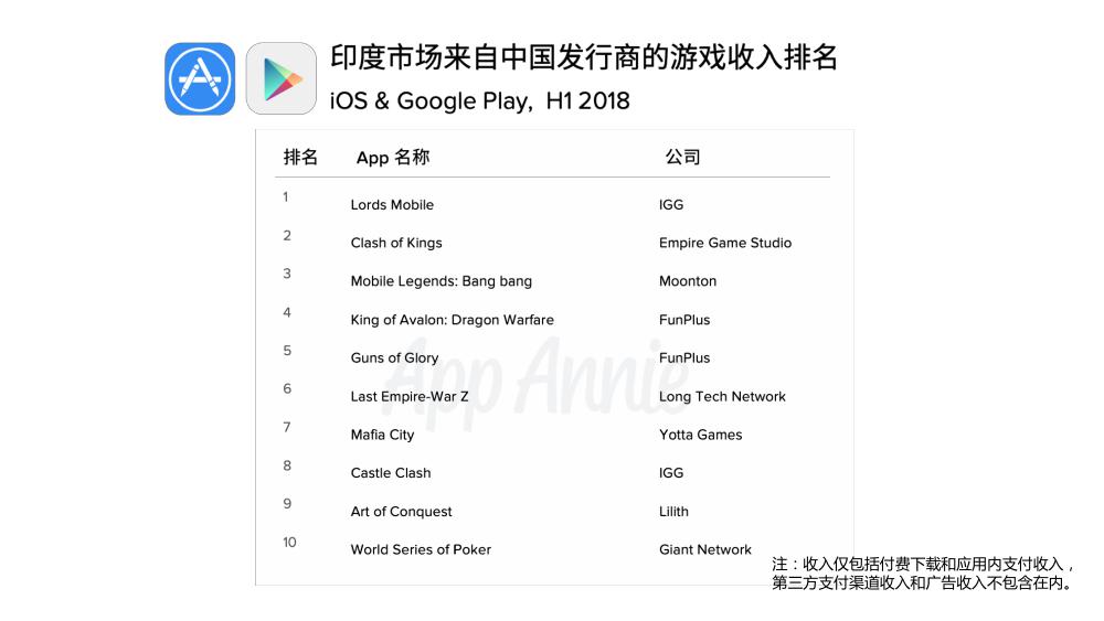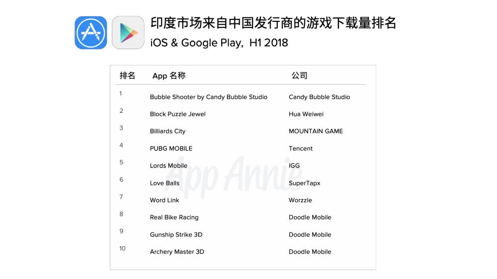 - 游戏方面,IGG、Elex、FunPlus 位列中国公司在印度游戏公司收入前三,沐童、猎豹移动、游族、龙创悦动、友塔游戏、Tap4Fun和腾讯也进入中国游戏公司收入榜前十。《Lords Mobile》、《Clash of Kings》位列收入榜前列;而 《Bubble Shooter》、《Block Puzzle Jewel》和《Billiards City》占据中国游戏下载量前三。