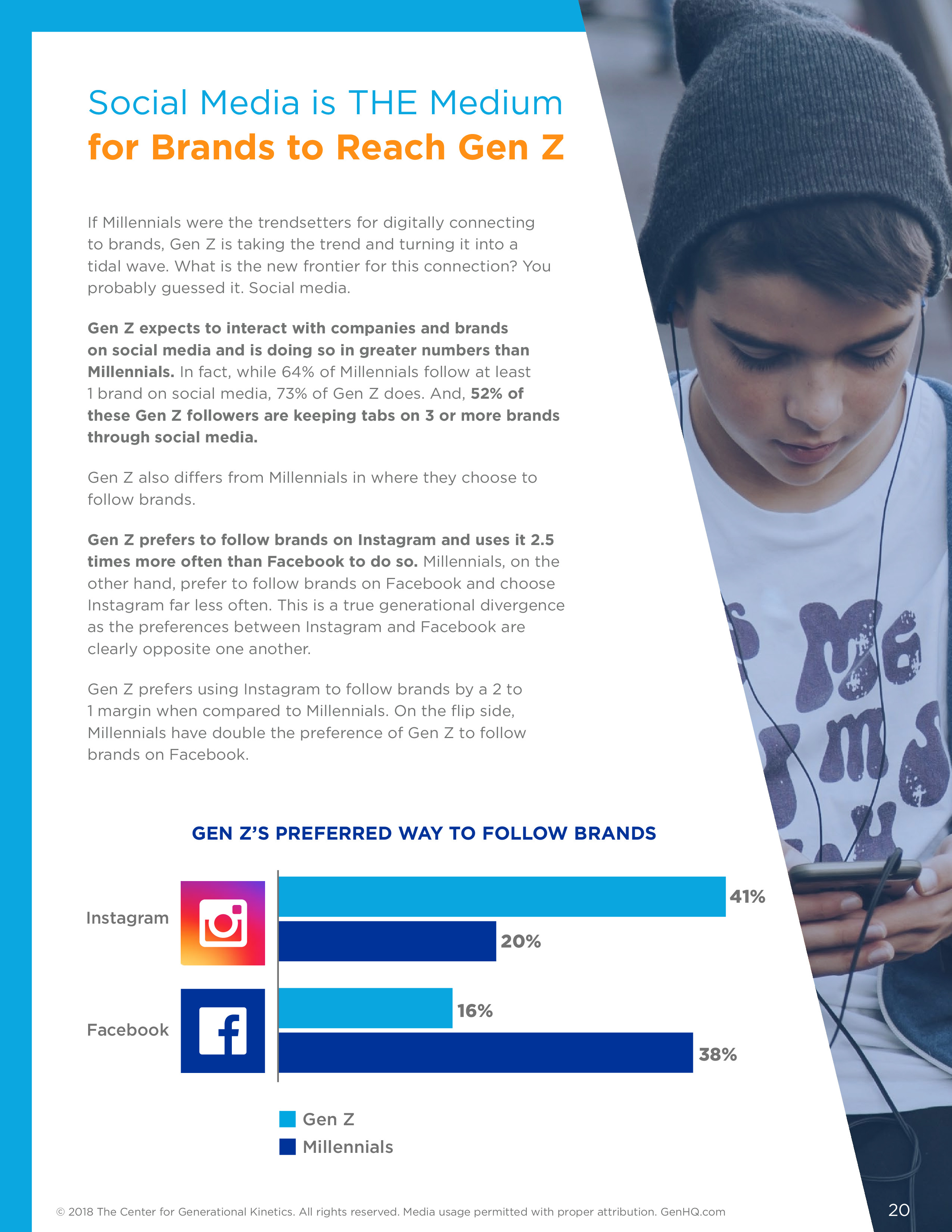 值得注意的是,并非所有年轻人都这样做。虽然Z世代的受访者将Instagram(41%)作为他们追随品牌的首选方式的可能性是其他世代的2.5倍,但对千禧一代的调查显示,情况正好相反。千禧一代选择Facebook作为他们追随品牌的首选方式,是Instagram的近两倍(分别为38%和20%)。