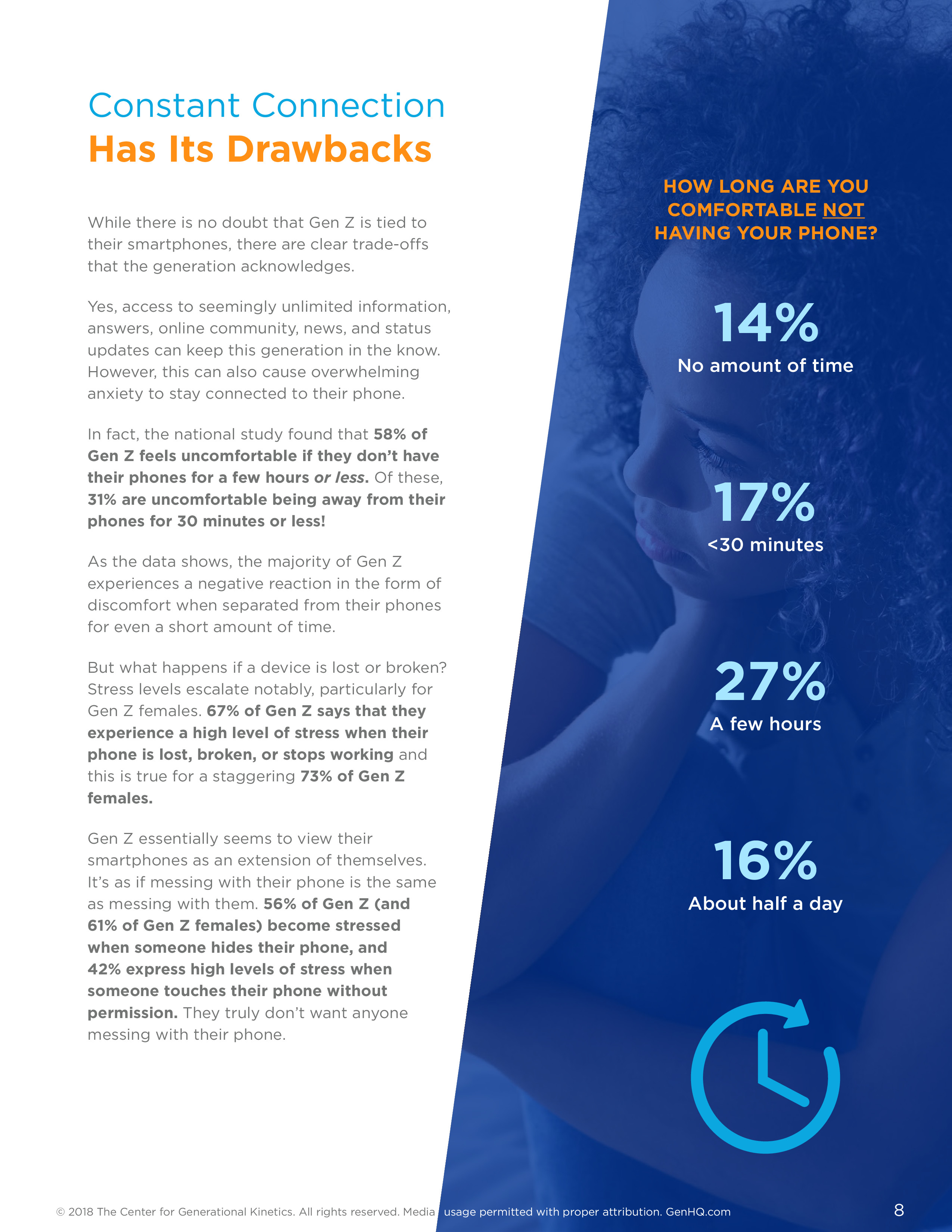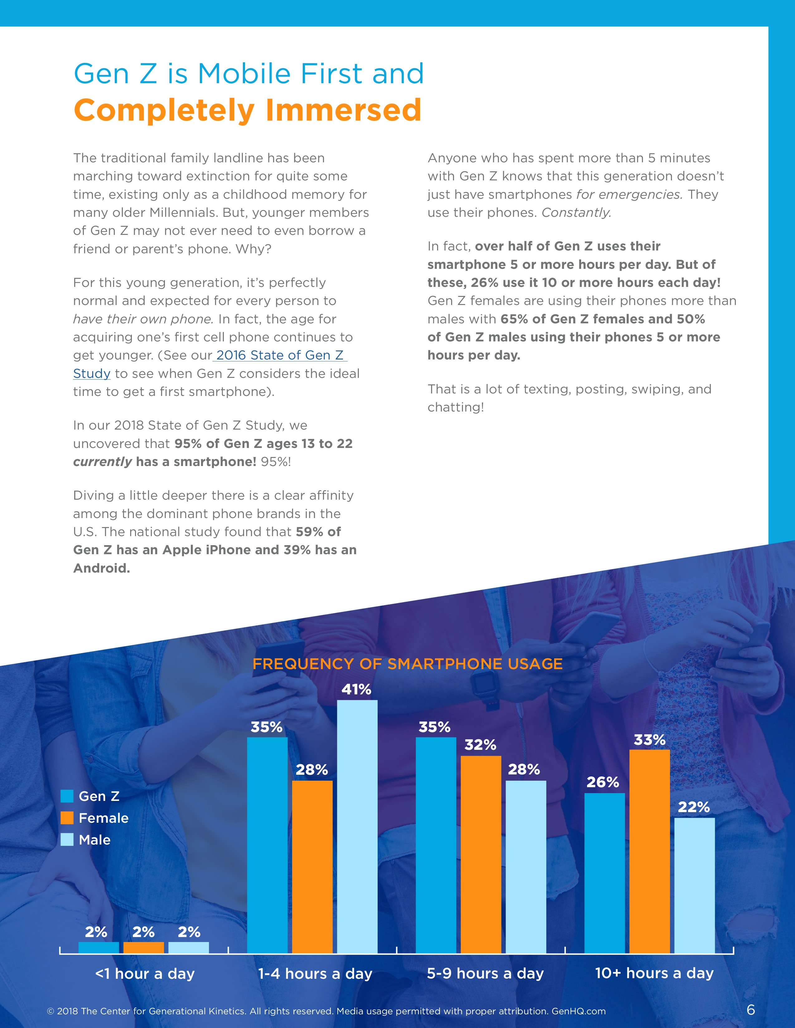 当然了,智能手机对Z世代非常重要,95%的Z世代当前拥有一部智能手机。深入挖掘,59%的Z世代使用iPhone,39%拥有Android手机。超过半数Z世代每天花5小时以上使用智能手机,其中有26%每天花10小时以上使用。
