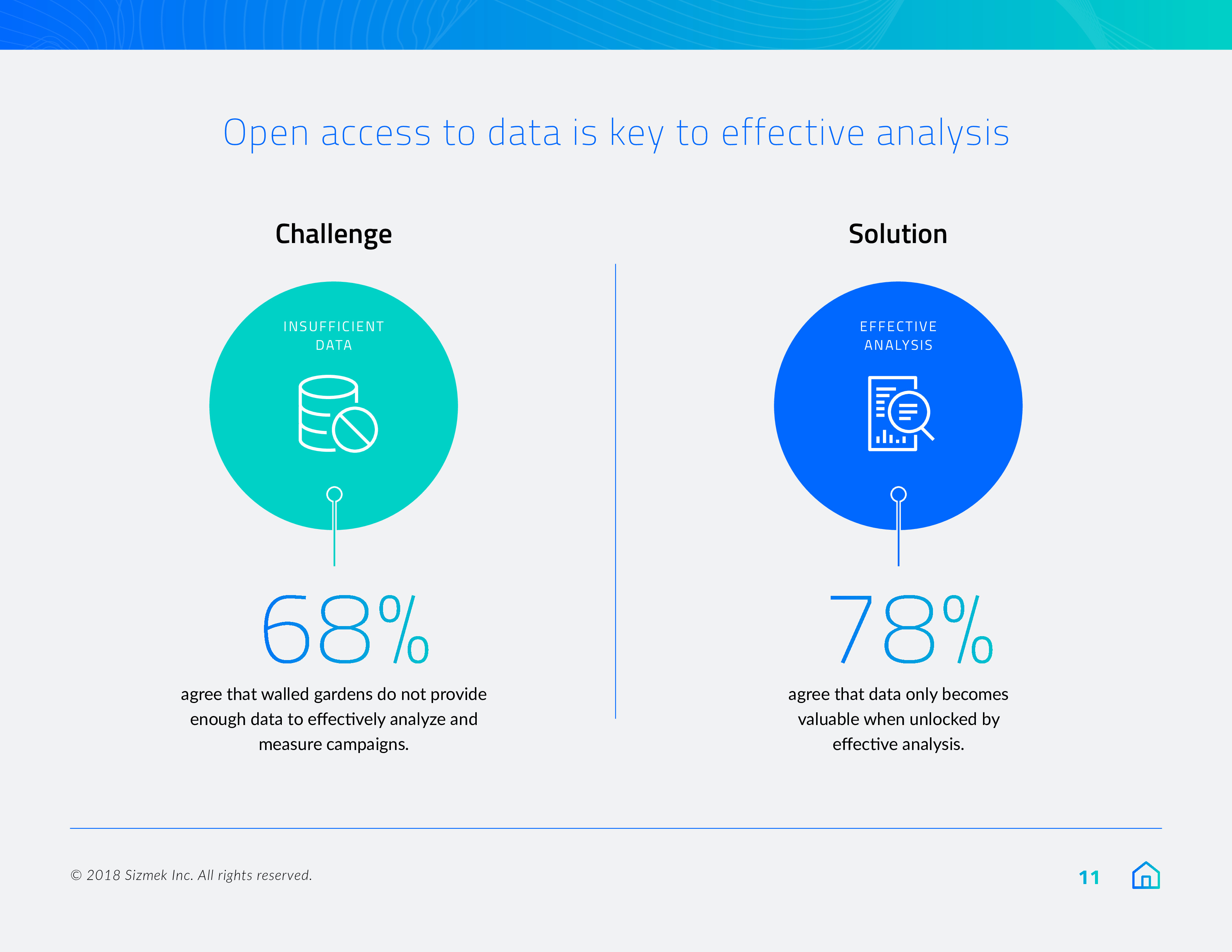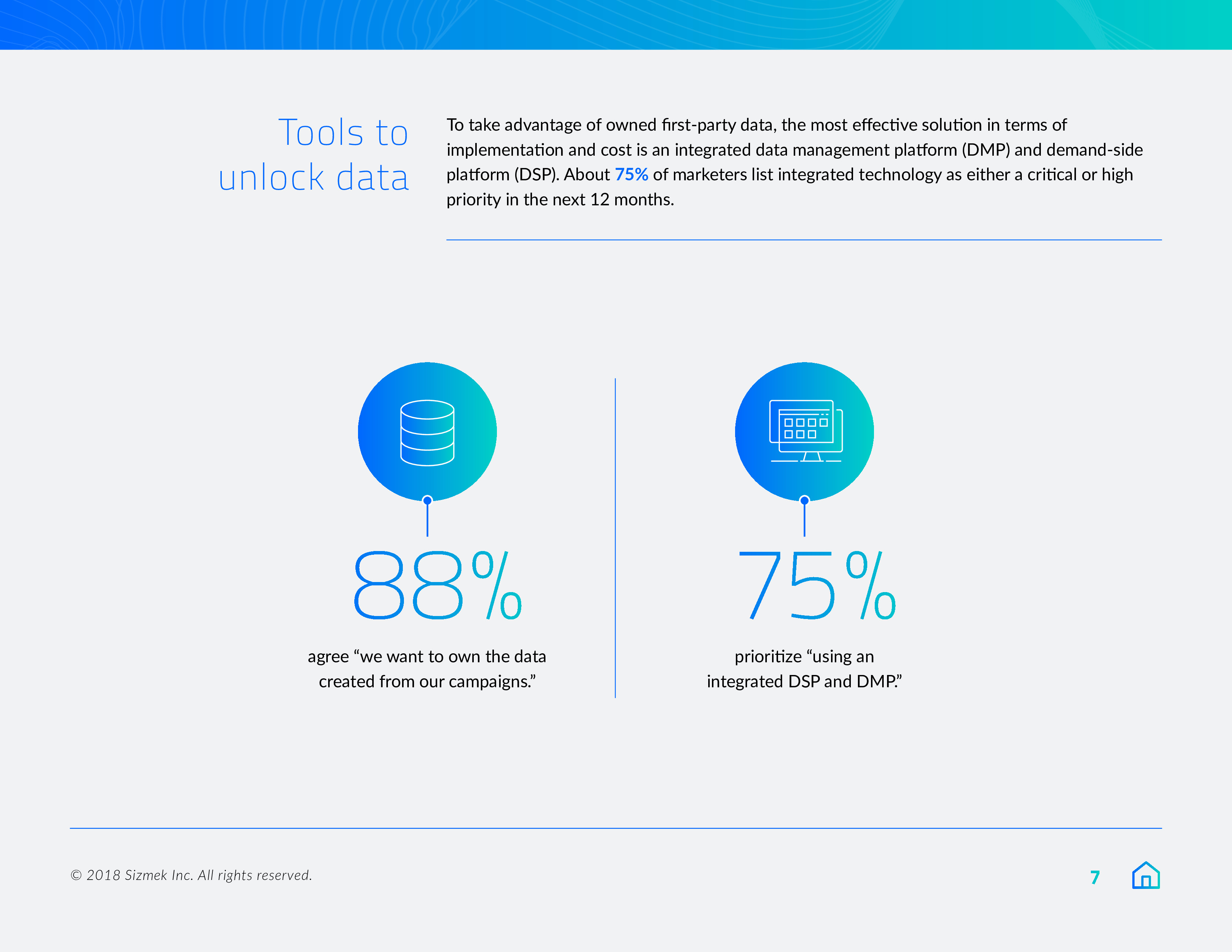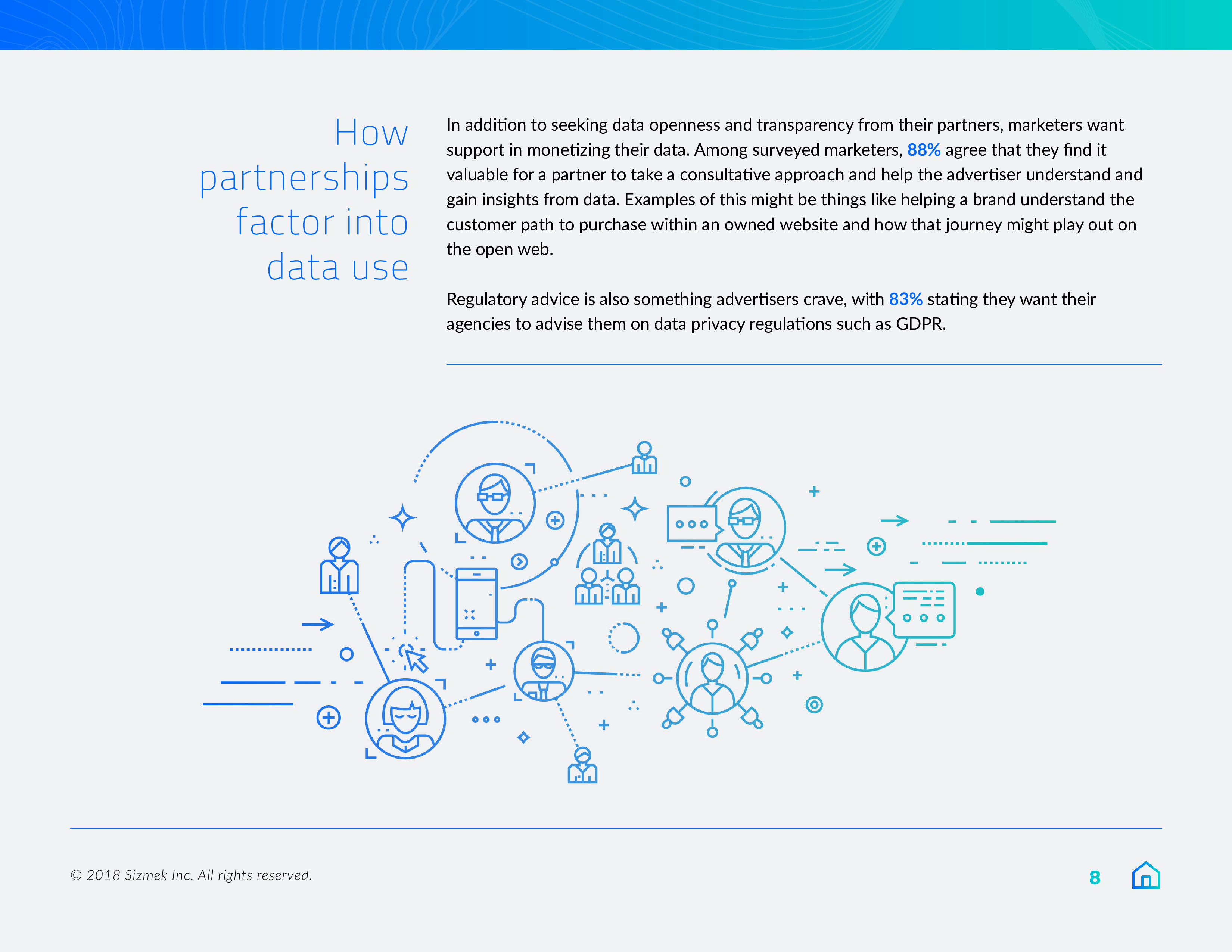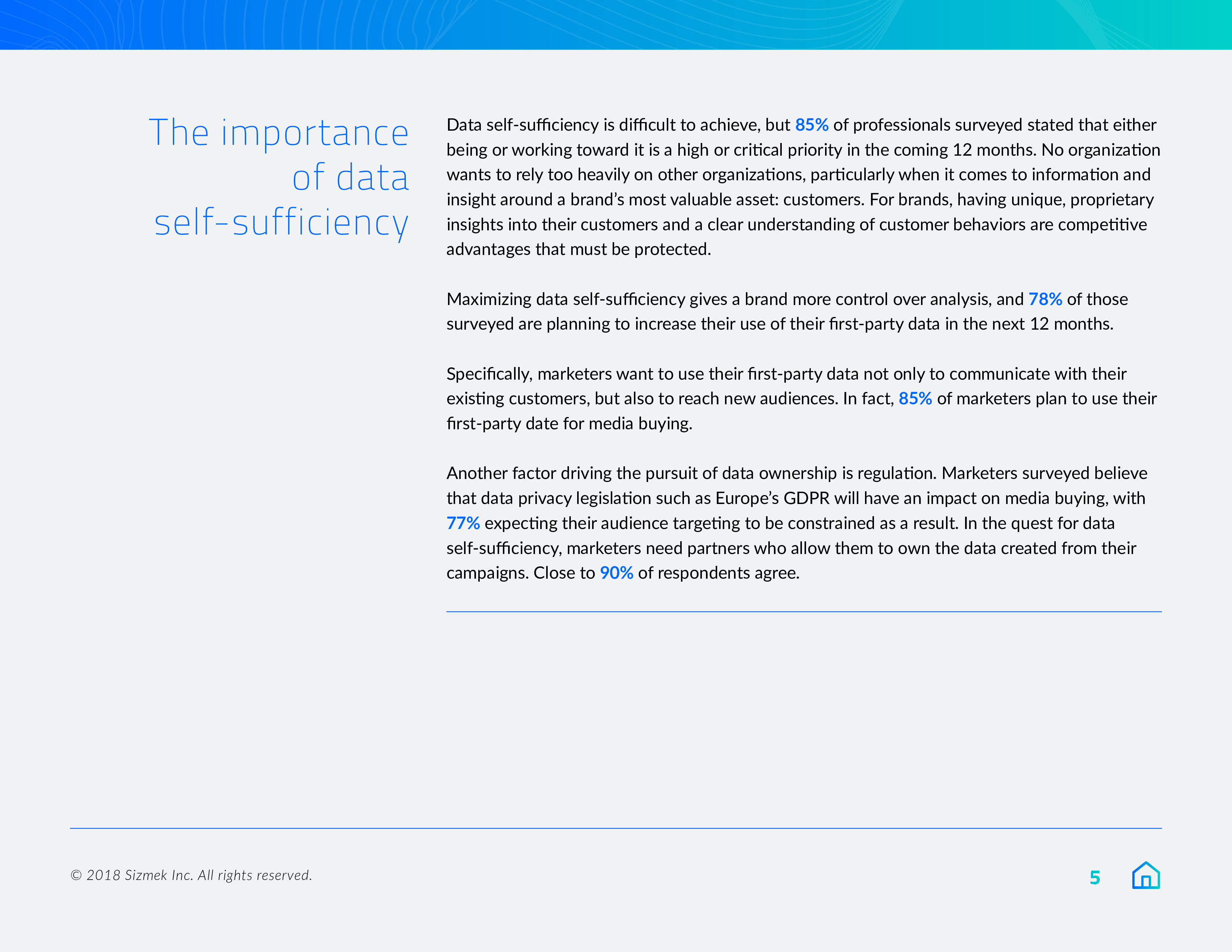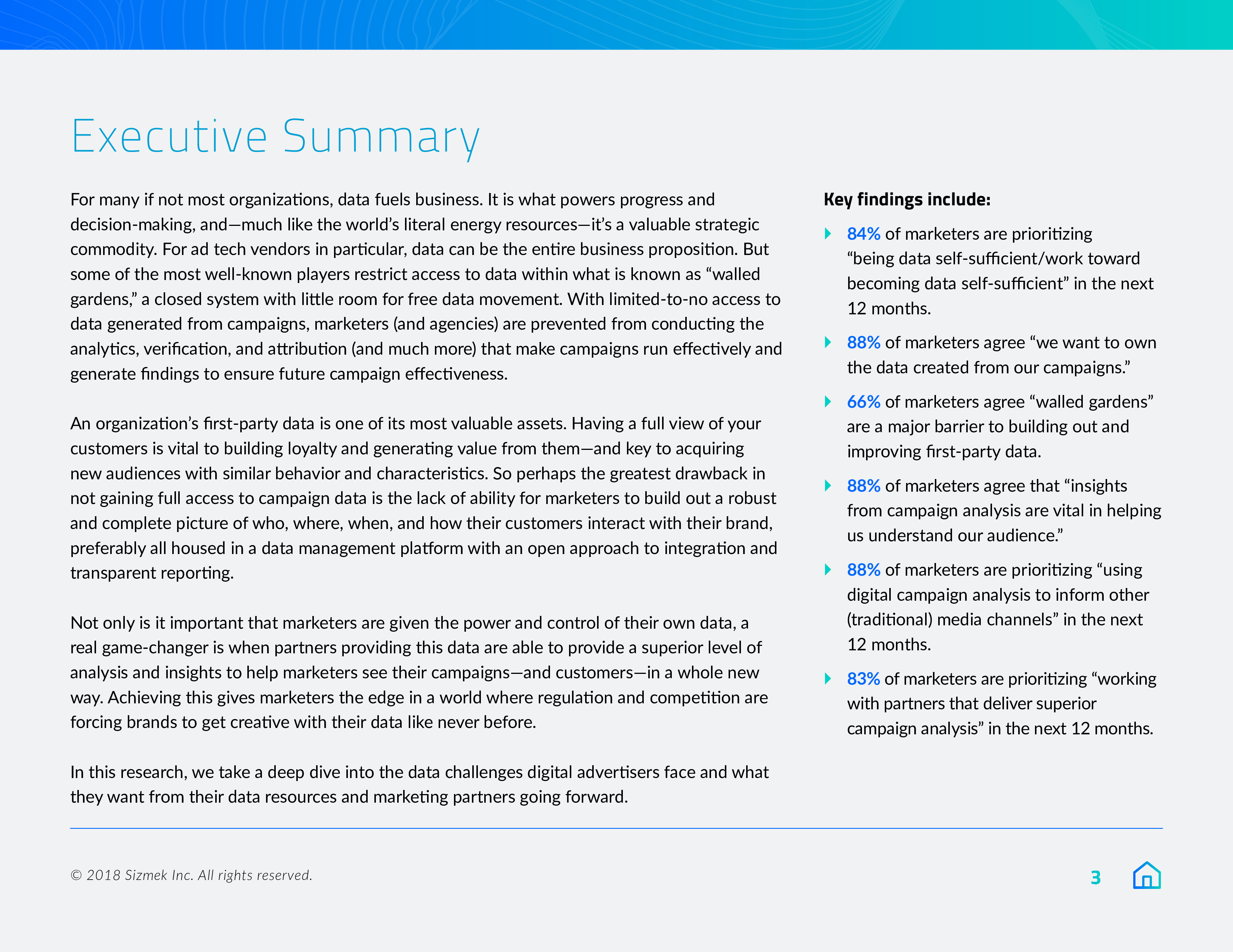 Sizmek发布了“2018年营销报告之数据、围墙花园和协作”。84%的营销人员将在明年优先考虑数据自给自足,或至少是在努力实现这一目标。此外,9/10的受访者(88%)希望拥有自己的广告数据,78%的受访者计划在来年增加对第一方数据的使用。