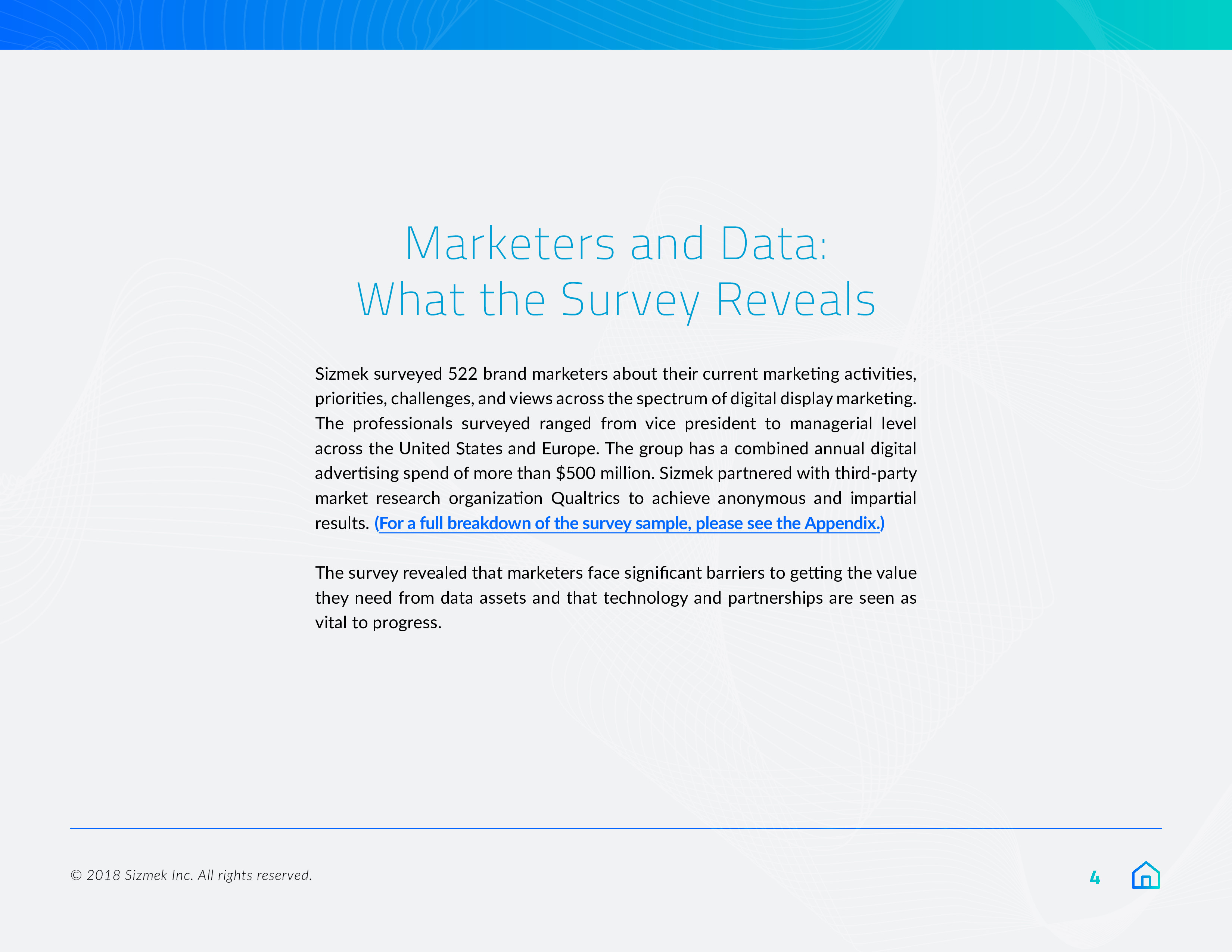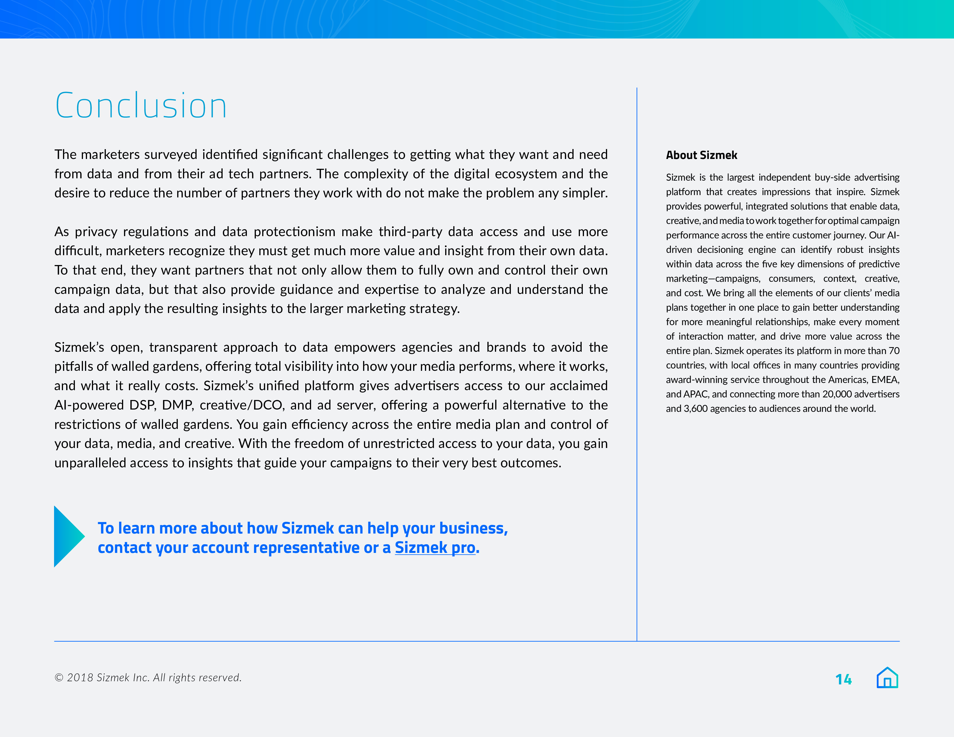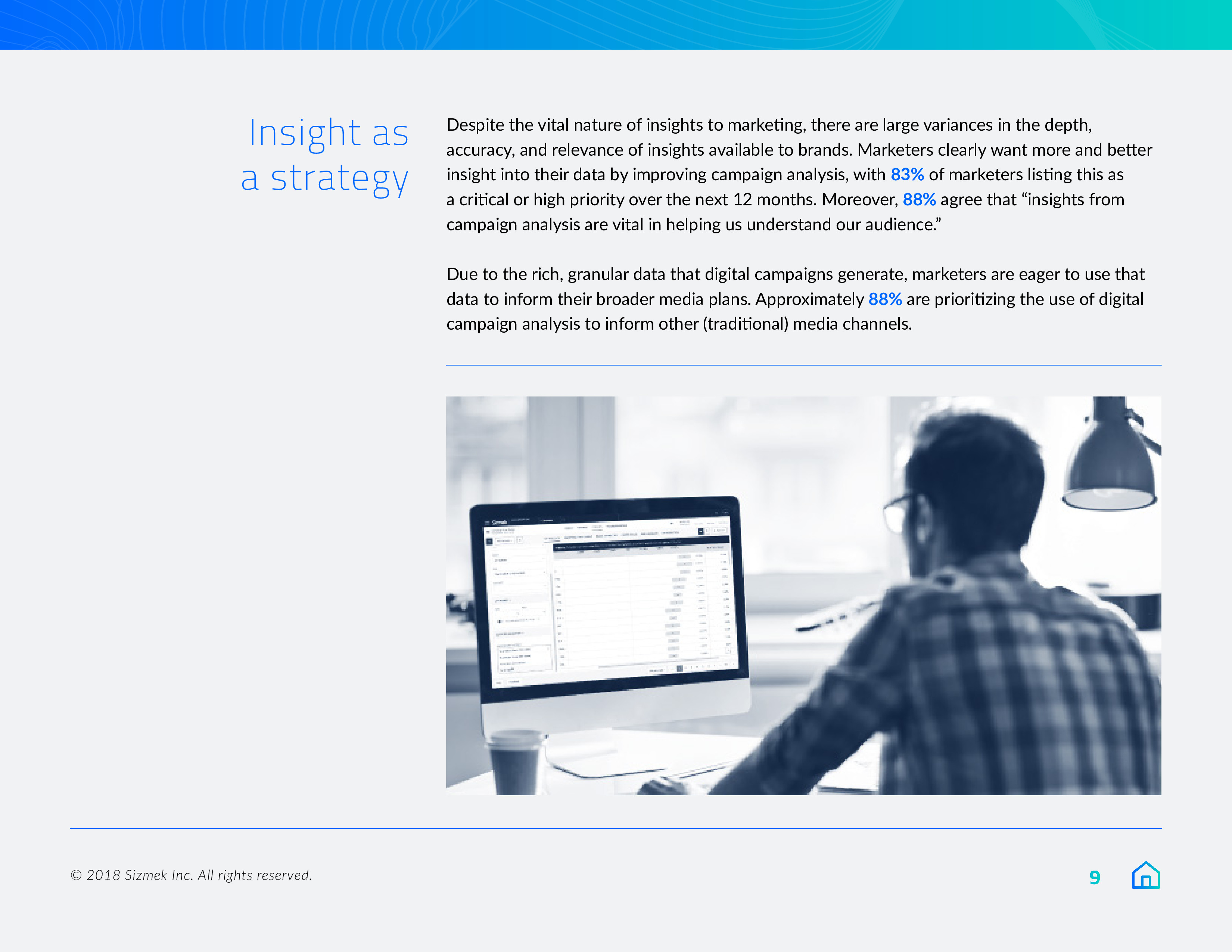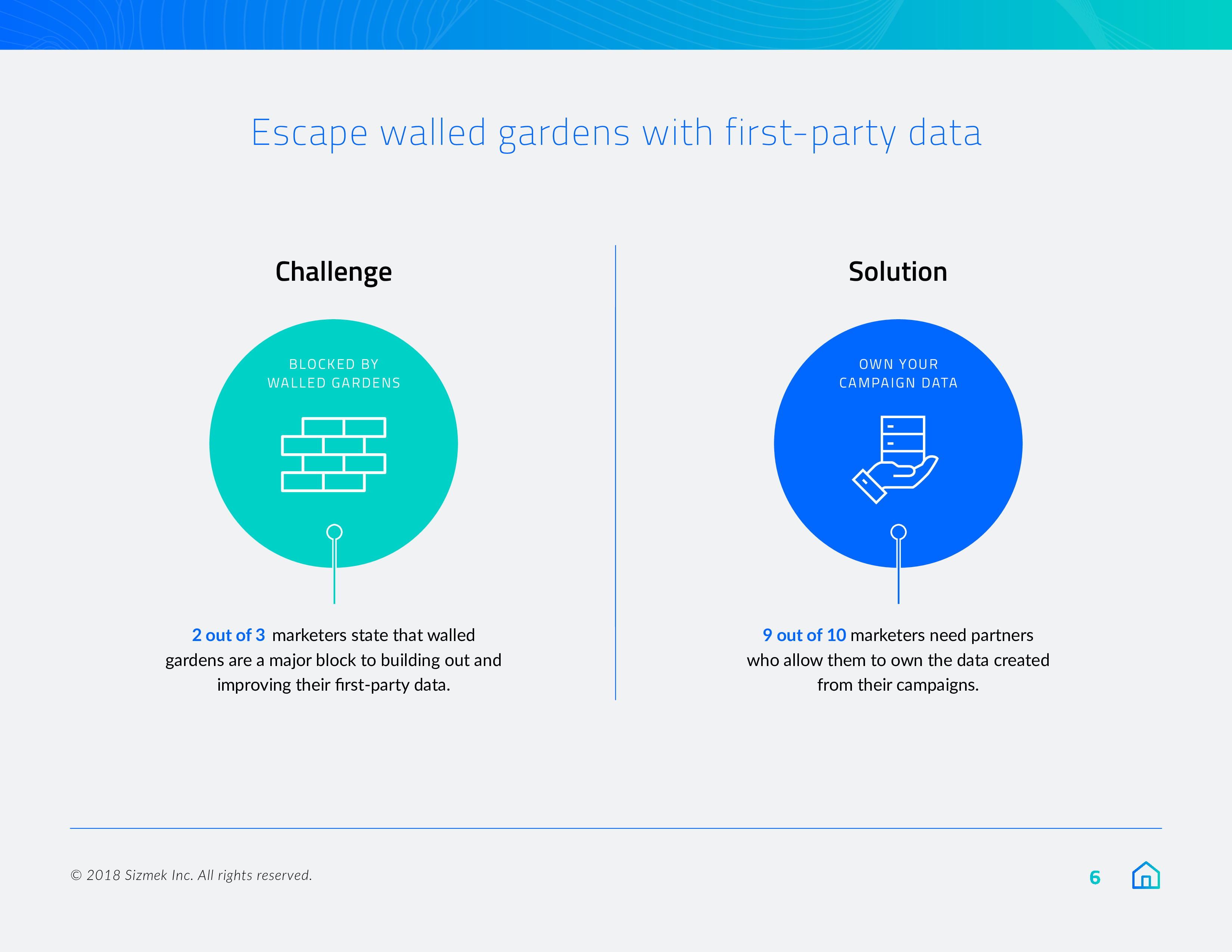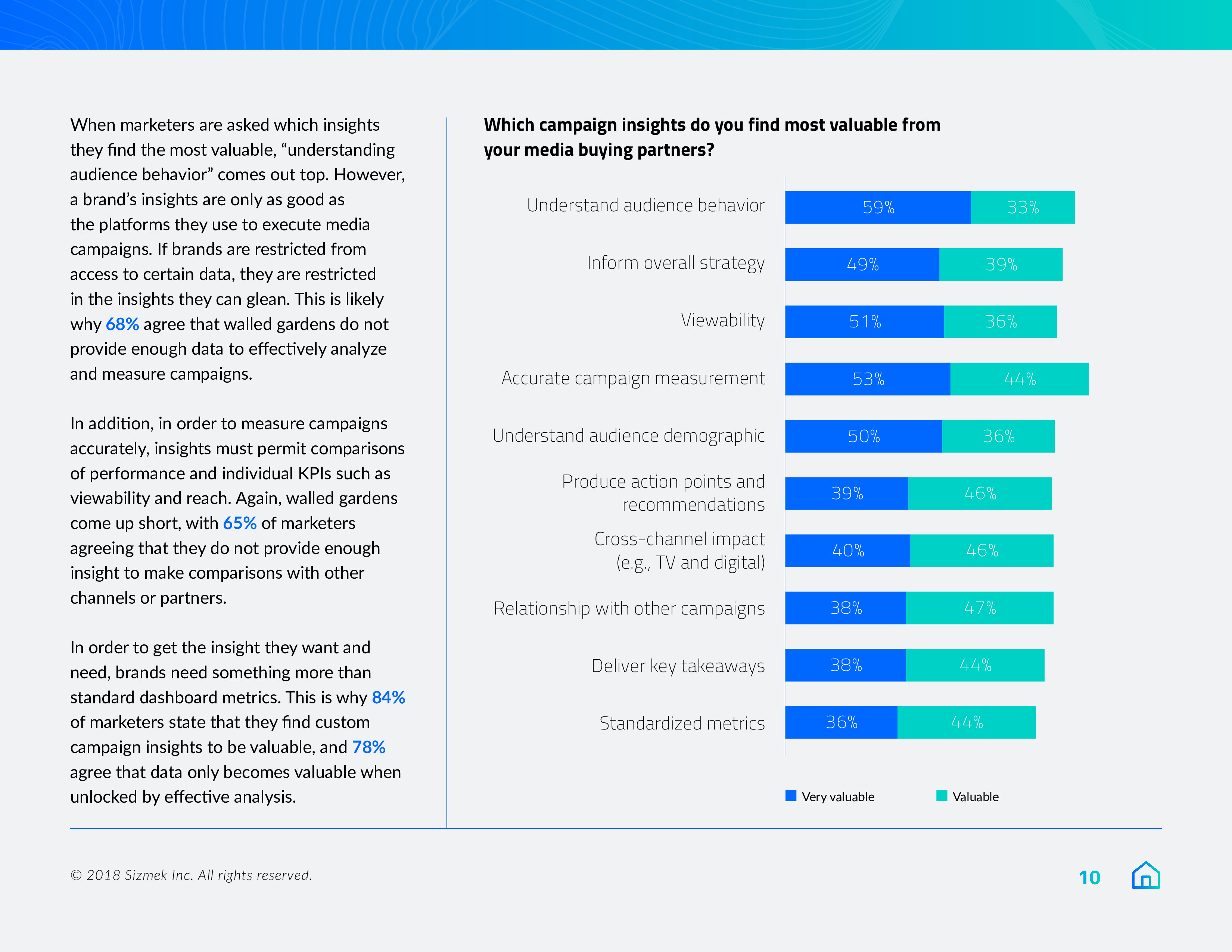 Sizmek发布了“2018年营销报告之数据、围墙花园和协作”。84%的营销人员将在明年优先考虑数据自给自足,或至少是在努力实现这一目标。此外,9/10的受访者(88%)希望拥有自己的广告数据,78%的受访者计划在来年增加对第一方数据的使用。