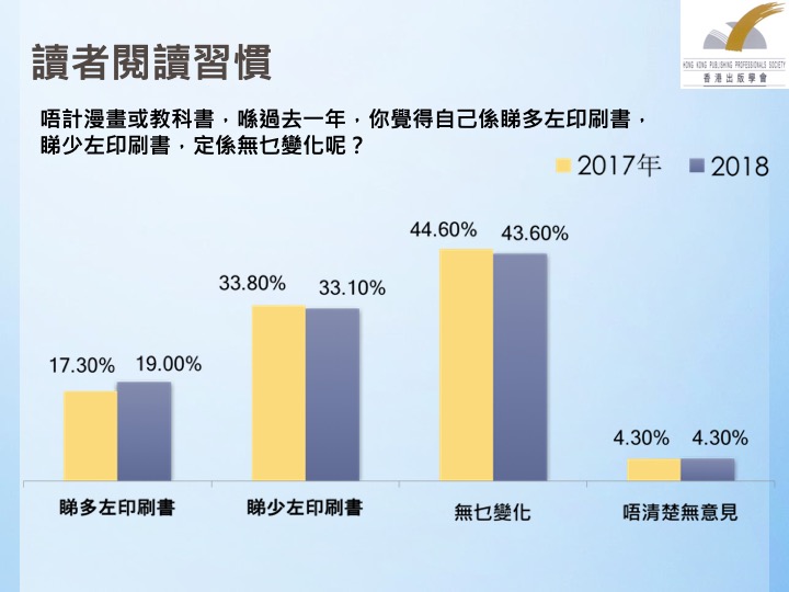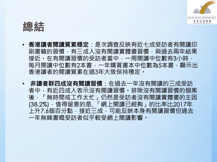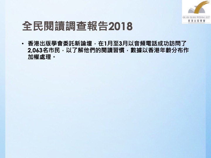 为了解香港居民的全民阅读情况,香港出版学会于2018年1月至3月委托新论坛,对2063名香港市民进行音频电话访问。近日,香港出版学会发布了调查报告,公布了2018年香港全民阅读调查报告。