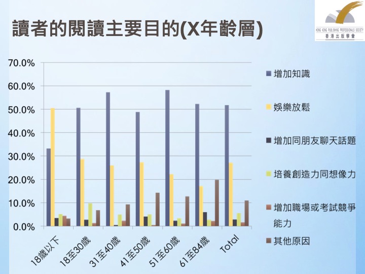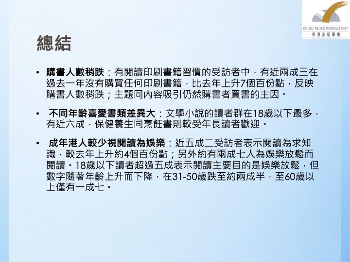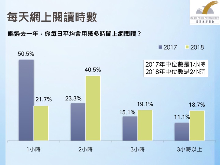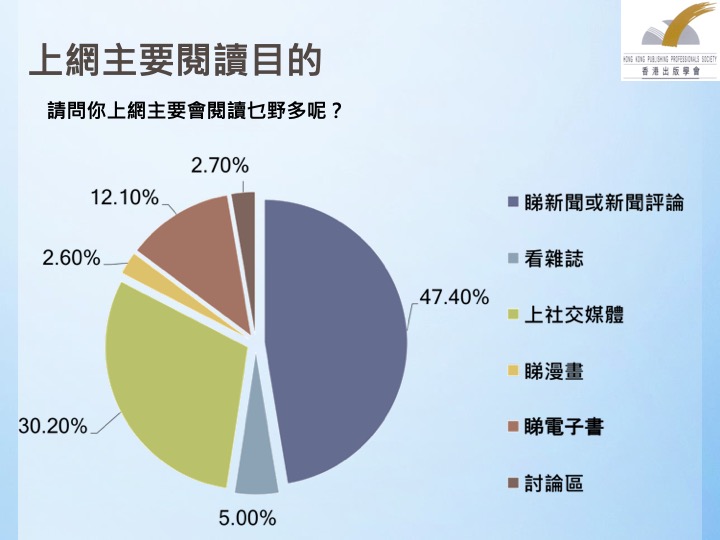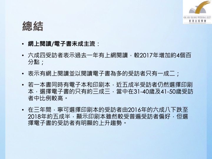 三是应留意网上及电子阅读的变化。在过去三年的调查中,可以看出网上阅读比例已经有明显,上升的趋势,而阅读的内容则未必是电子书籍。因此,出版学会建议政府应提供支持与资助,培养出版业界人才,协助香港出版界迎接网上阅读及,电子阅读的潮流。