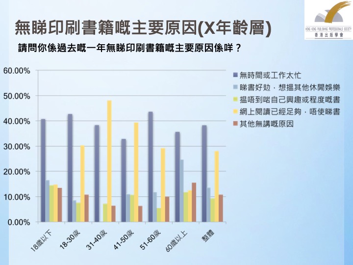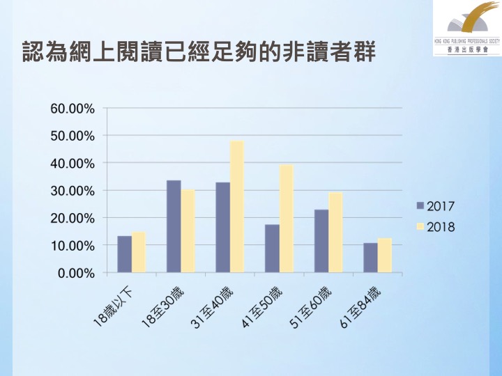 在读者人群的年龄构成方面,调查报告显示年轻的香港市民群体印刷,书籍阅读率最高,18至30岁、31至40岁两个年龄段的受访者群体印刷,书阅读率超过八成,而61-84岁年龄段的印刷书阅读率仅为39.8%。