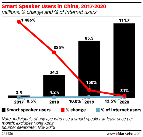 随着中国制造商积极竞争,这一增长将继续。到2019年,预计中国将有8550万智能音箱用户。