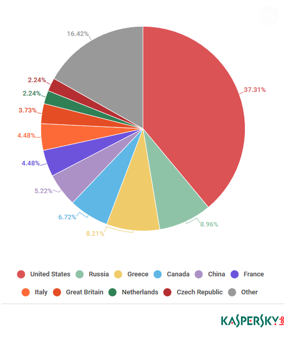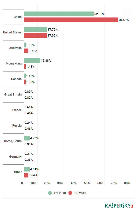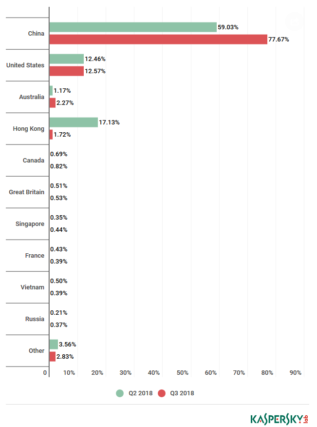 和以前一样,中国是受攻击次数最多的地方(78%),美国重新回到第二名(12.57%),澳大利亚排在第三位(2.27%)。韩国有史以来第一次进入前10名。