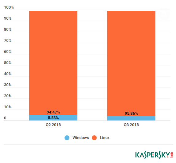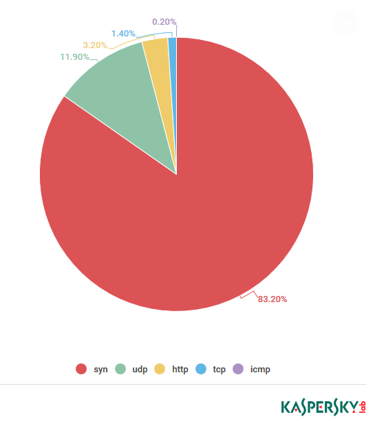 Linux僵尸网络的份额仅比上一季度略有增长。在这种情况下,DDoS攻击的类型分布没有太大变化,SYN Flood仍然排在第一位(83.2%)。