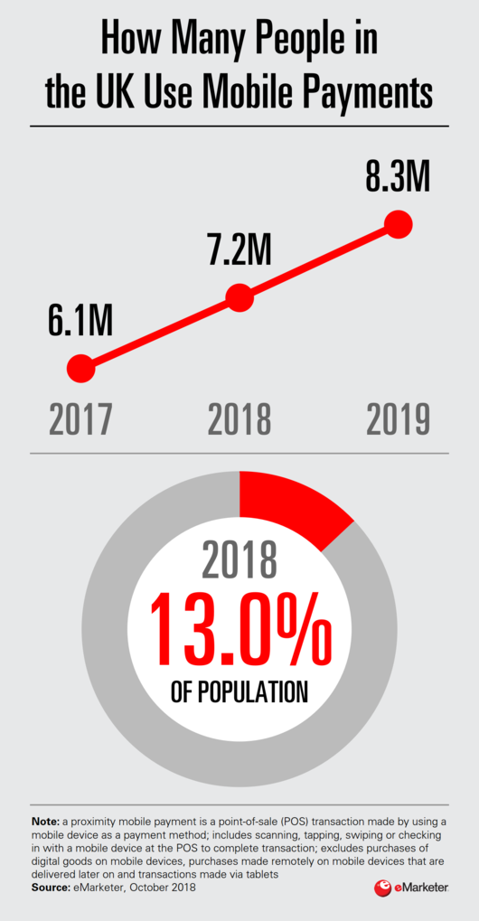 根据eMarketer 的预测,2018年英国有720万人使用移动支付,占总人口的13.0%。阻碍英国人采用移动支付的主要原因是非接触式信用卡一直是人们习惯使用的主流支付选项。但是,英国移动支付仍有增长空间,受到Apple Pay、Google Pay和Samsung Pay的推动。