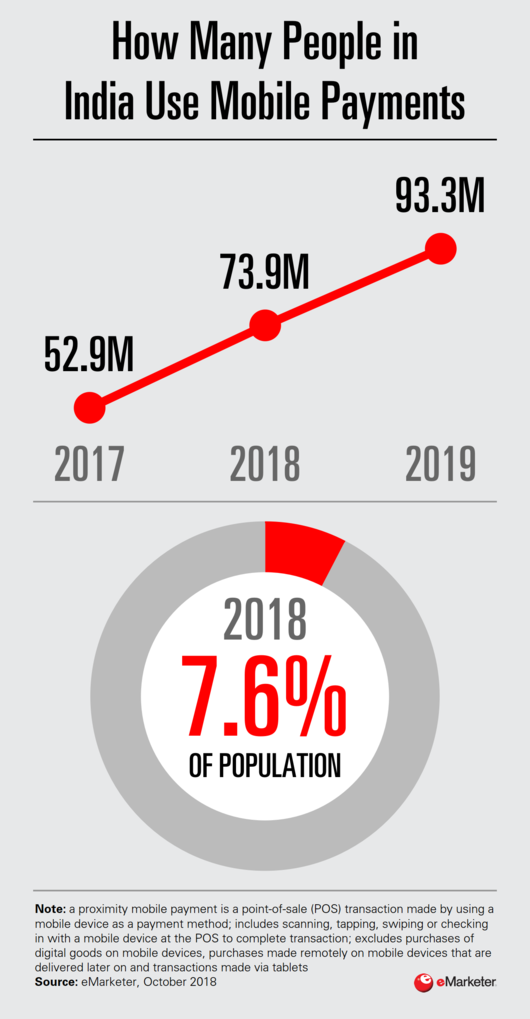 印度是世界上近场支付增长最快的市场之一。今年,印度有7390万人使用移动支付,占总人口的7.6%,同比增长39.7%。印度移动支付普及的动力有很多,最大的是2016年11月推出的高额现金非货币化政策。Paytm是印度移动支付市场的领袖,用户人数为3.2亿。谷歌则在2017年在印度推出了Google Pay,此后有了很大增长。
