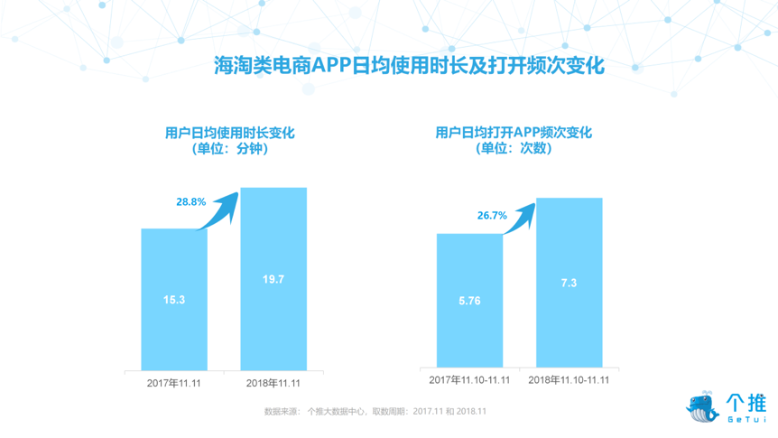 可以看出,在中美贸易战余波未平的大背景下,中国消费者对舶来品的热情却依旧不减。在今年双十一期间,手机用户日均使用海淘类APP的时长和打开频次较2017年出现大幅上升,分别达到了19.7分钟和7.3次,海淘类电商app对用户注意力和粘性的把控,愈来愈强。