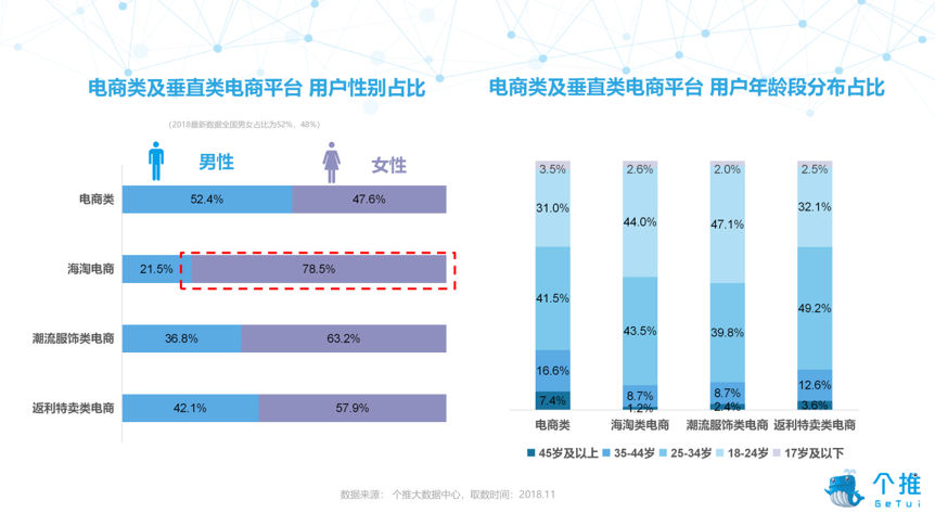 据个推大数据中心数据分析,2018年电商类app的总体渗透率较2017年,由21.9%增至25.8%,双十一消费向移动端转移的趋势进一步增强,同时呈现出了消费偏好细分化的特点:在垂直电商领域,2018年双十一期间,以网易考拉、小红书等为代表的海淘类电商app整体渗透率同比增长了104.8%,而以贝贝、蜜芽等为代表的母婴类app和以蘑菇街、楚楚街等为代表的潮流服饰类app的整体渗透率则出现了下滑。