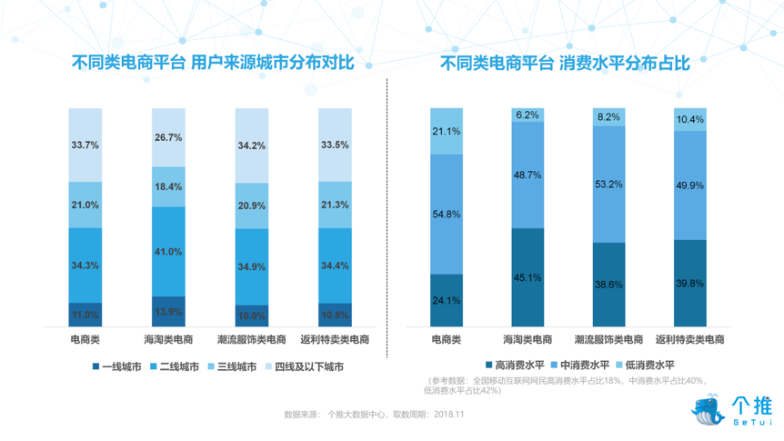 由于一二线城市的消费者对于国外商品信息的敏感度较高和交通便利等因素的影响,海淘类电商app的用户多集中于一二线城市,并且具有高消费水平的特征。