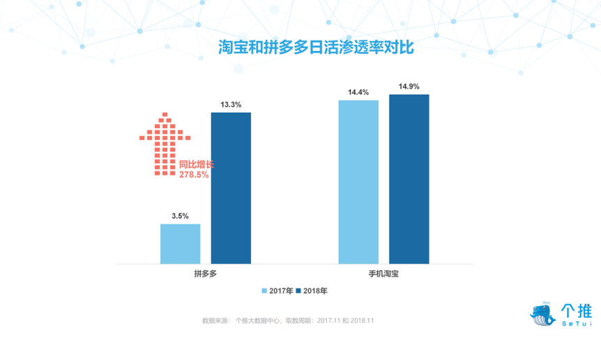 拼多多的迅速崛起,成为2018年的现象级电商。截至2018年11月,拼多多的渗透率较2017年同比暴增278.5%,用户日均使用时长由2017年的11.6分钟上升至32.4分钟,增幅达178.4%,用户日均打开频次也达到8.8次,同比增长88.7%。早在2014年,淘宝就提出了农村战略,开始发力下沉市场。但从今年双十一的数据来看,淘宝用户在三四线及以下市场的占比仍未赶超拼多多。