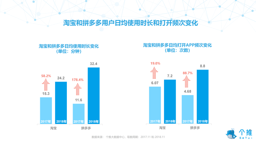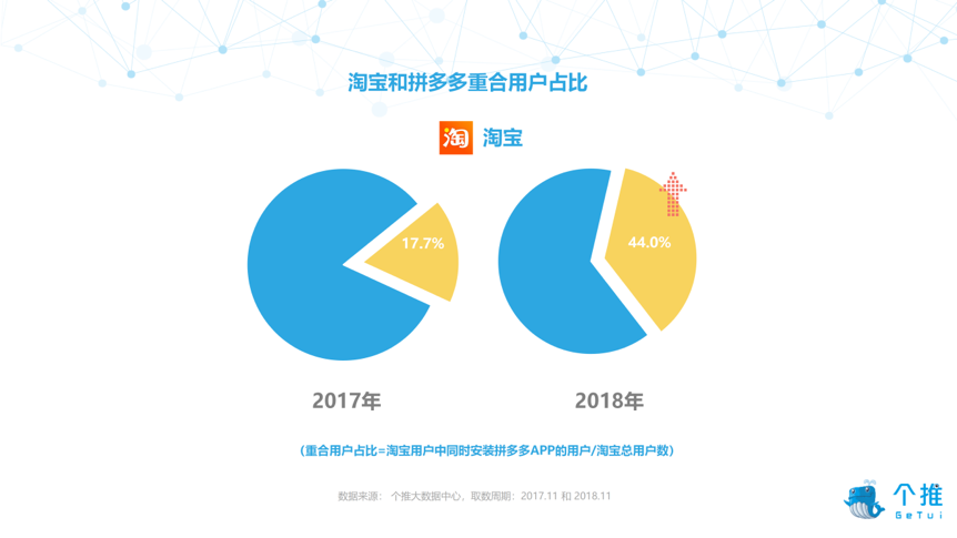 从淘宝和拼多多的重合用户占比中,可以看出,2018年,已有44%的淘宝用户同时安装了拼多多,而在2017年,该比例仅为17.7%,拼多多迅速渗透着淘宝用户,这两大电商的竞争也势必会更加激烈。
