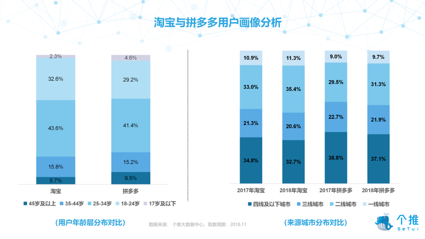 在用户来源上,2018年拼多多在三四线城市用户来源占比达到了59%,淘宝则为53.3%略低于拼多多。但是,从数据上也可以看到,拼多多也在尝试向高阶市场的拓展,2018年拼多多在一二线城市的用户较2017年增长了2.5%。极力想下沉的淘宝,与不断向上的拼多多,将在“五环外市场”上演一场激烈“厮杀”。三四线城市和农村市场,相较于一二线城市有着独特的商业逻辑,在这些市场中,更加注重社交属性和圈层文化,拼多多在45岁以上及17岁以下的用户占比都高于淘宝,具有明显的分散化特征。