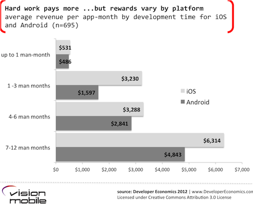 上面的数据是针对整个开发者的情况,并没有考虑平台的差异。如果对比Android和iOS平台的投入产出比则发现,iOS的总体回报要稍好。