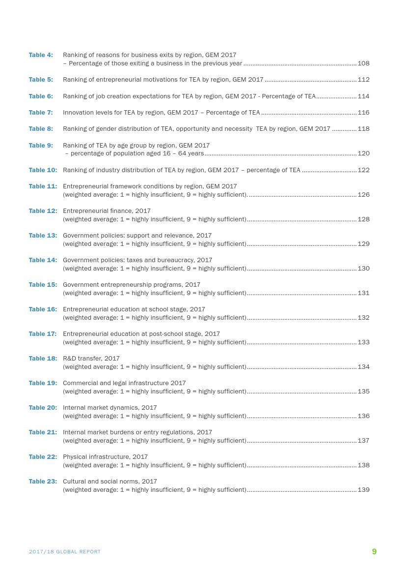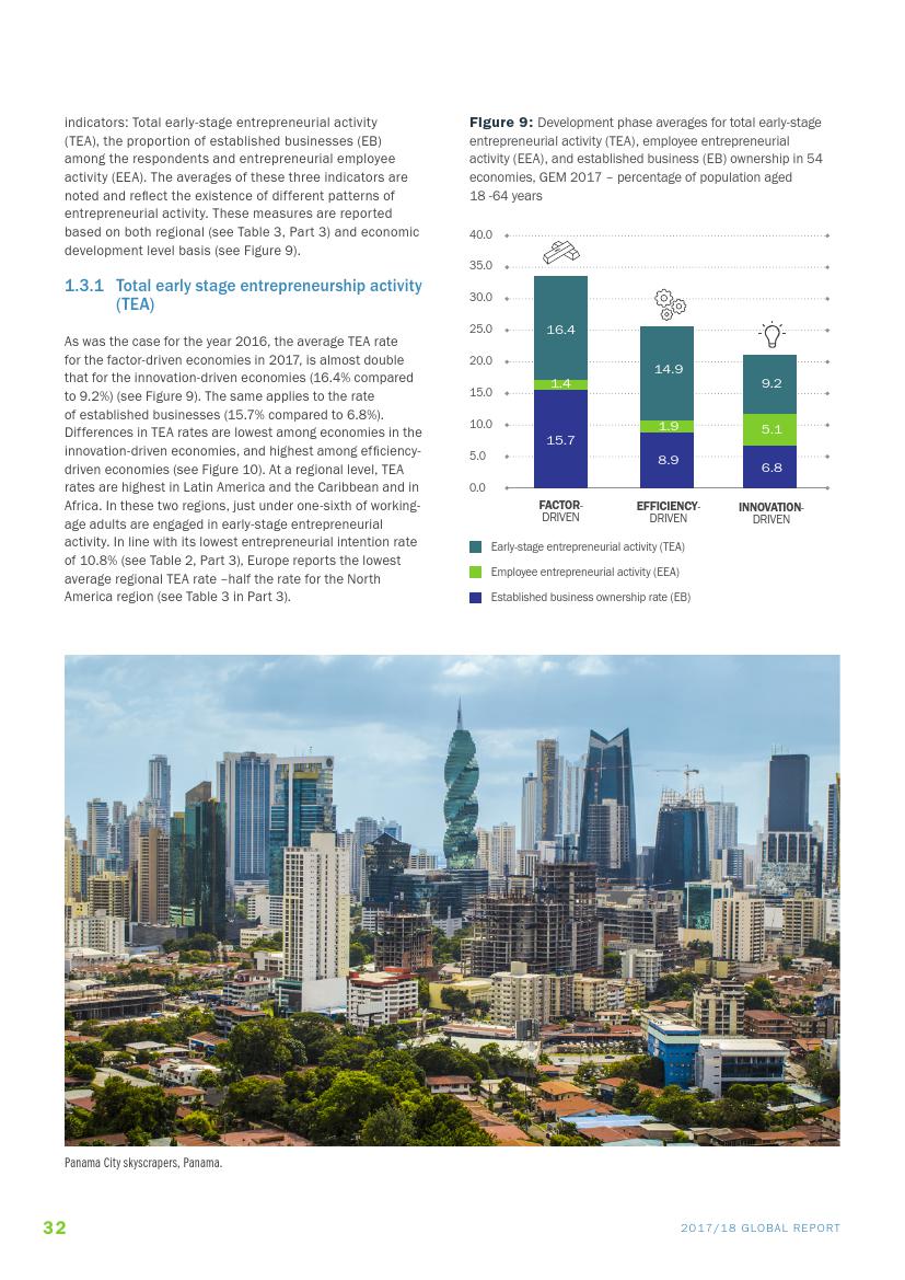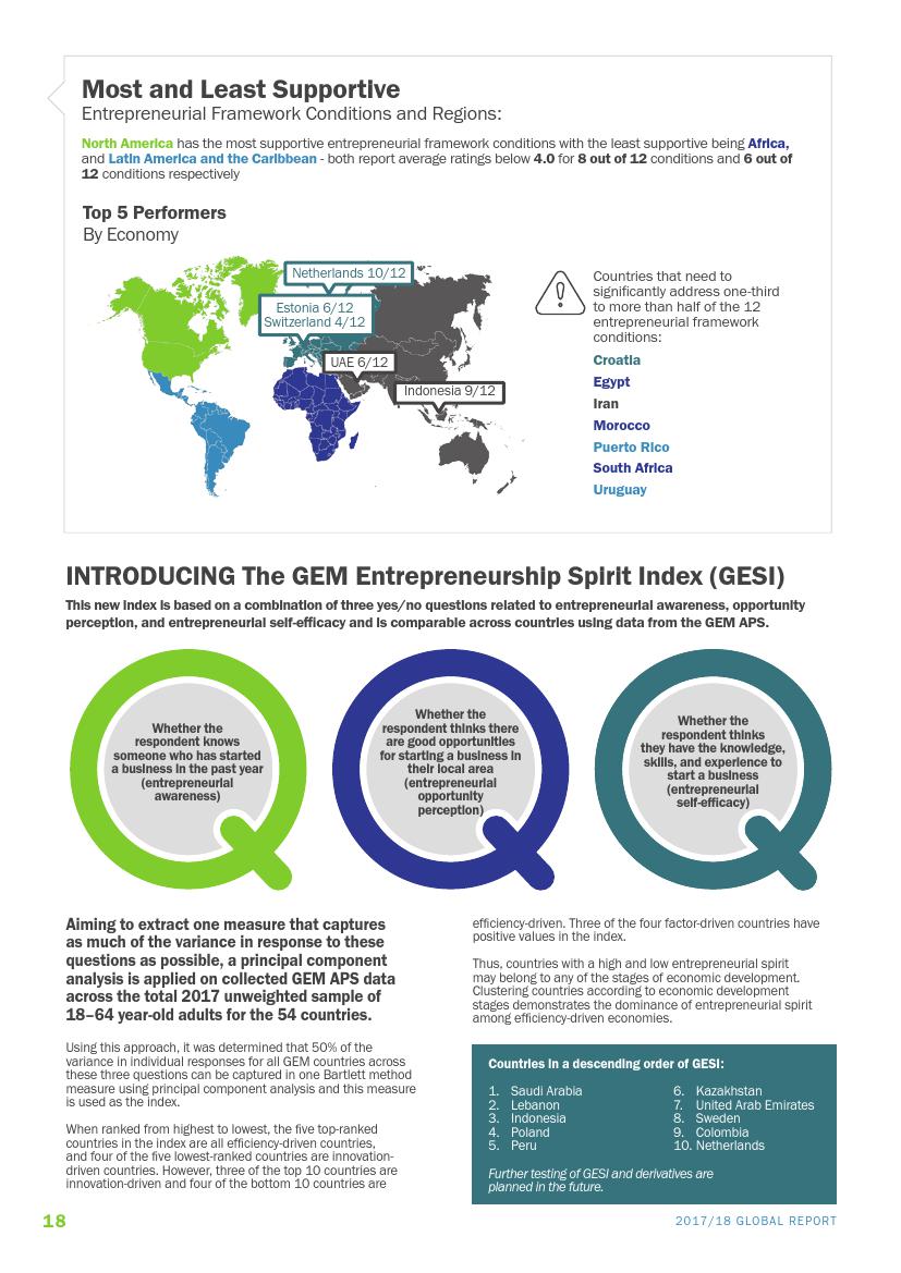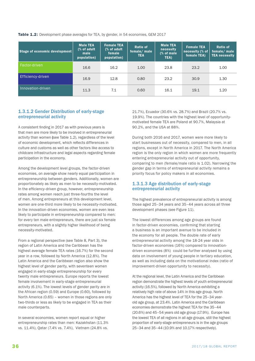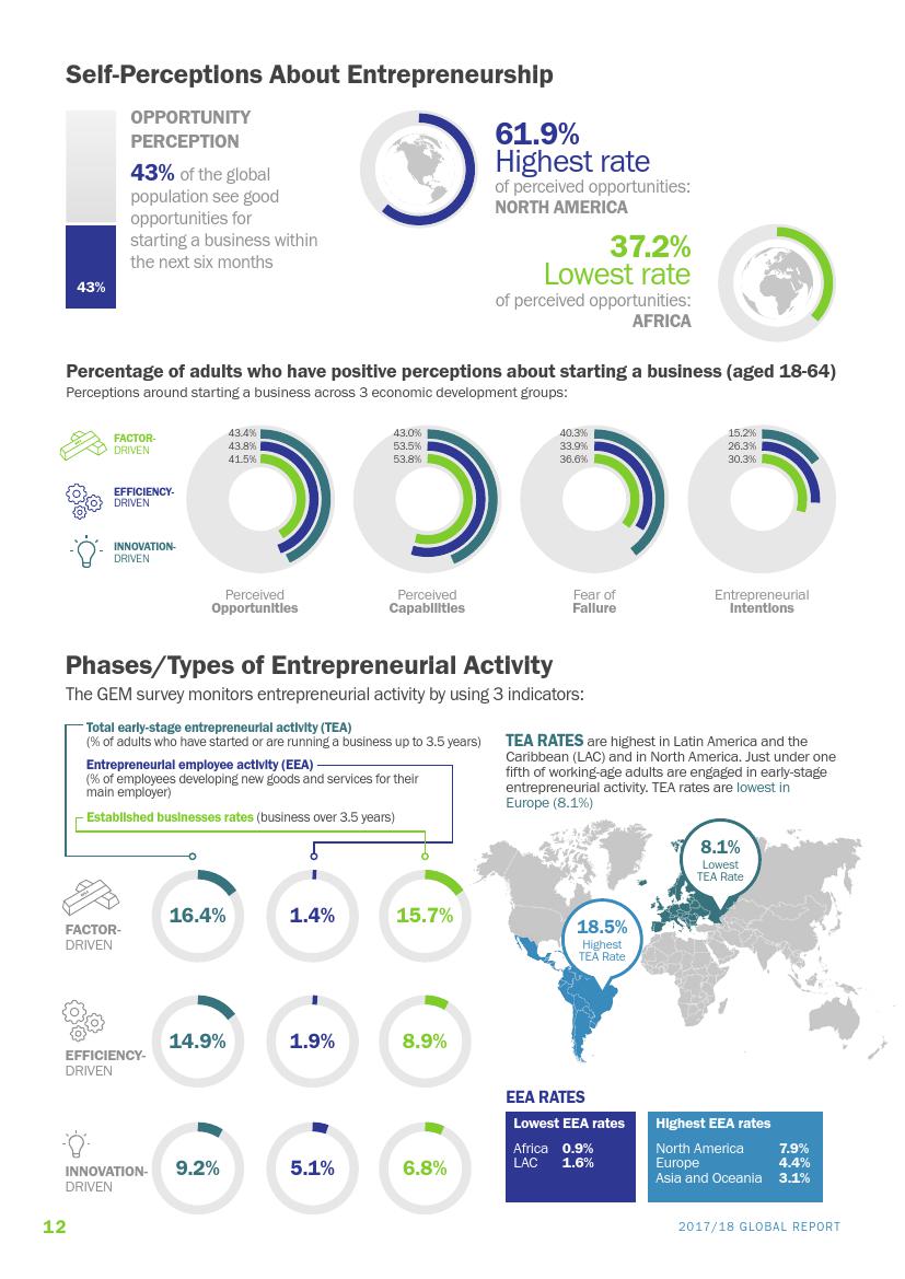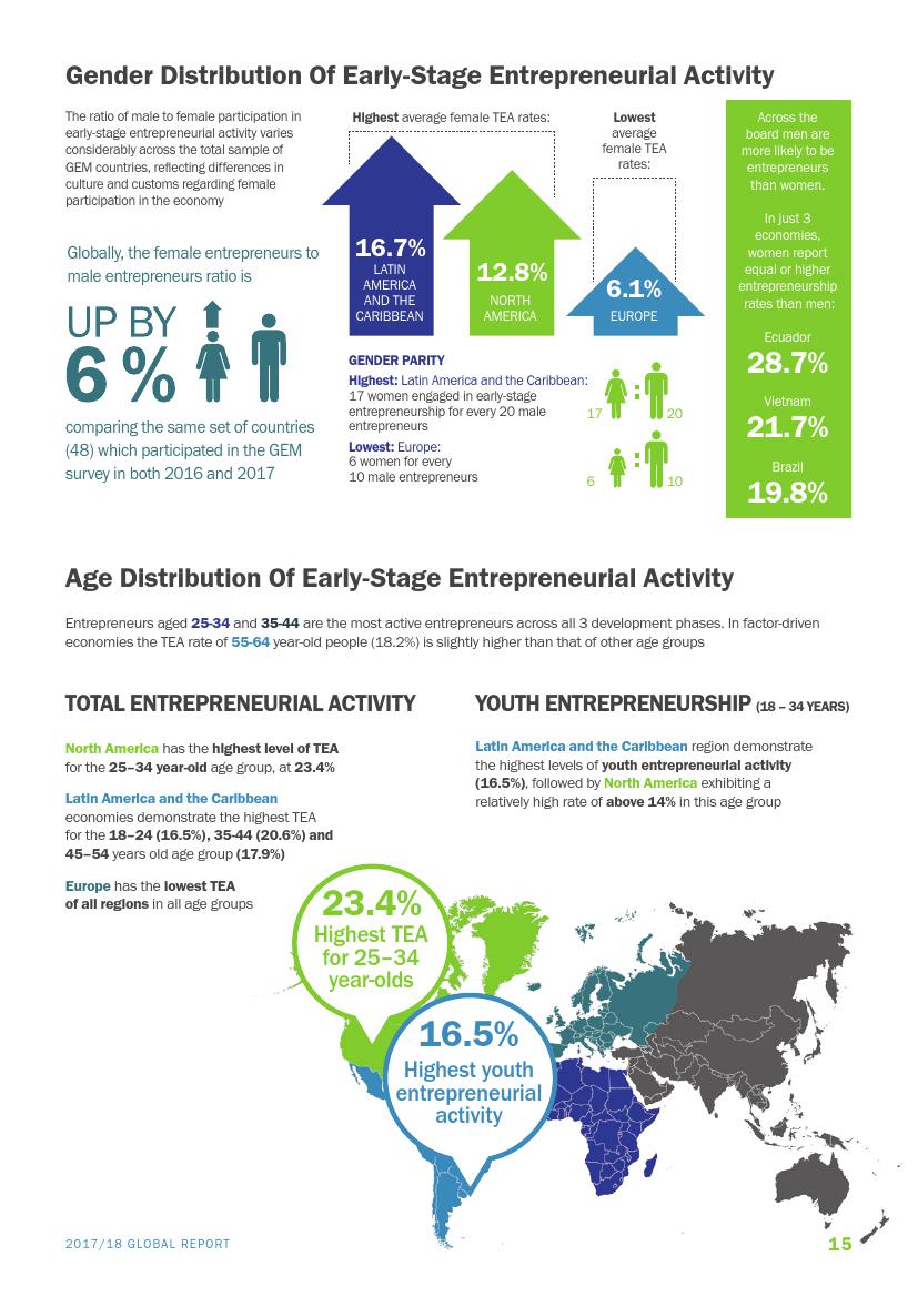 - 女性创业表现最好的区域是拉丁美洲和加勒比地区,女性创业活动指数(TEA)平均比率为16.7%,其次是北美,为12.8%。