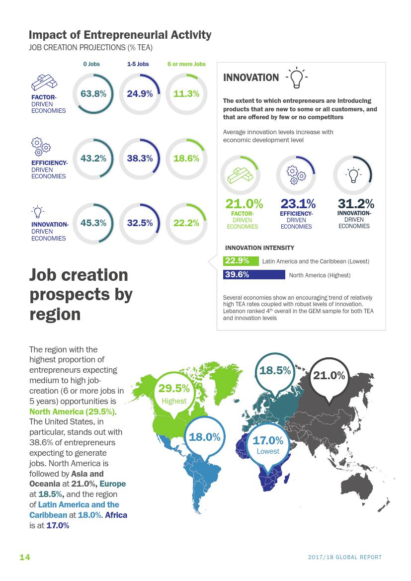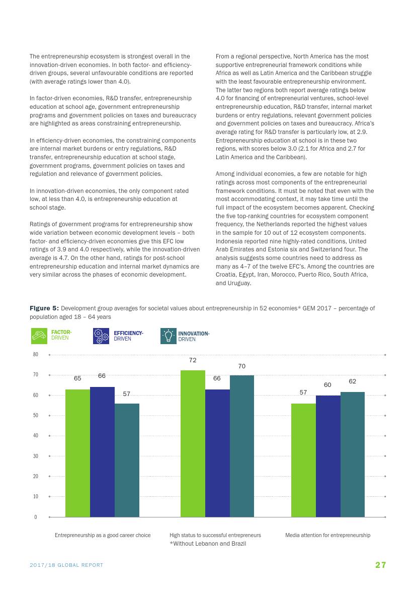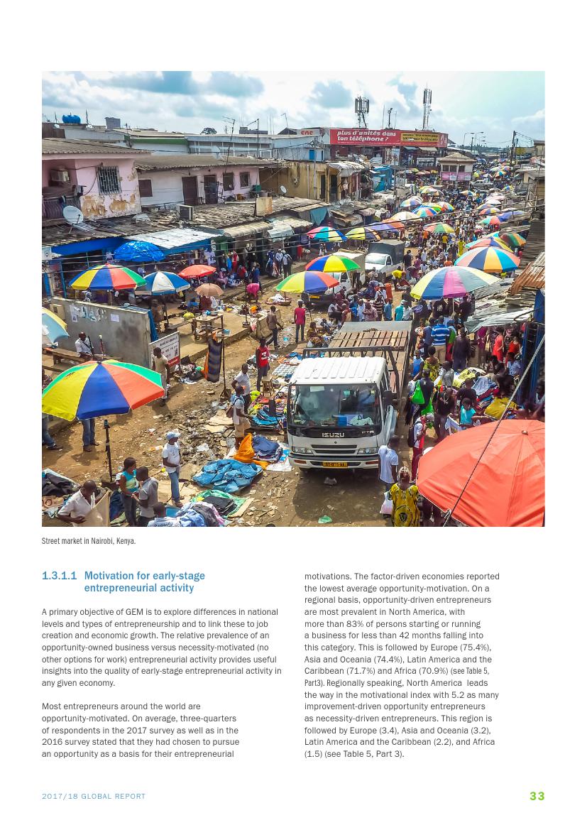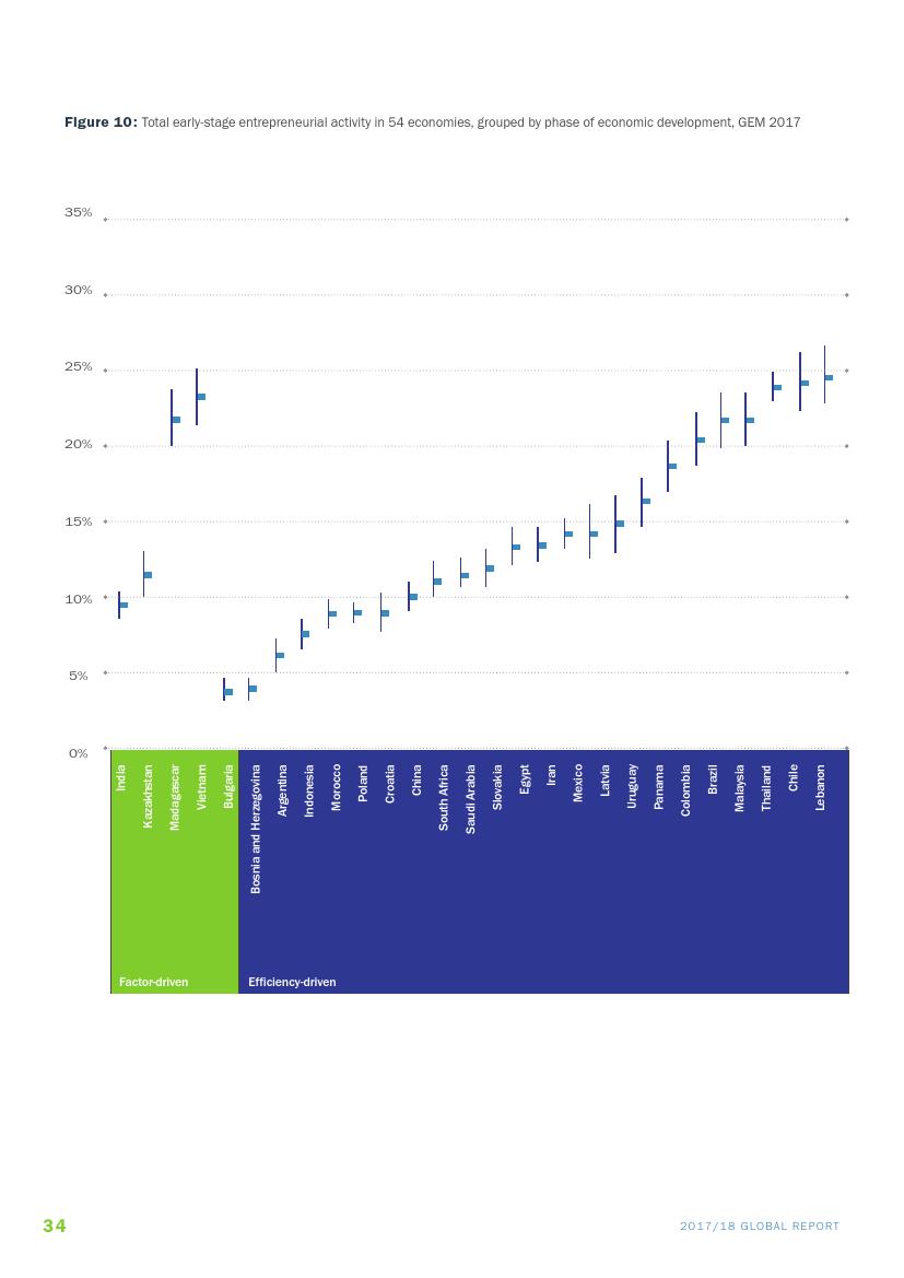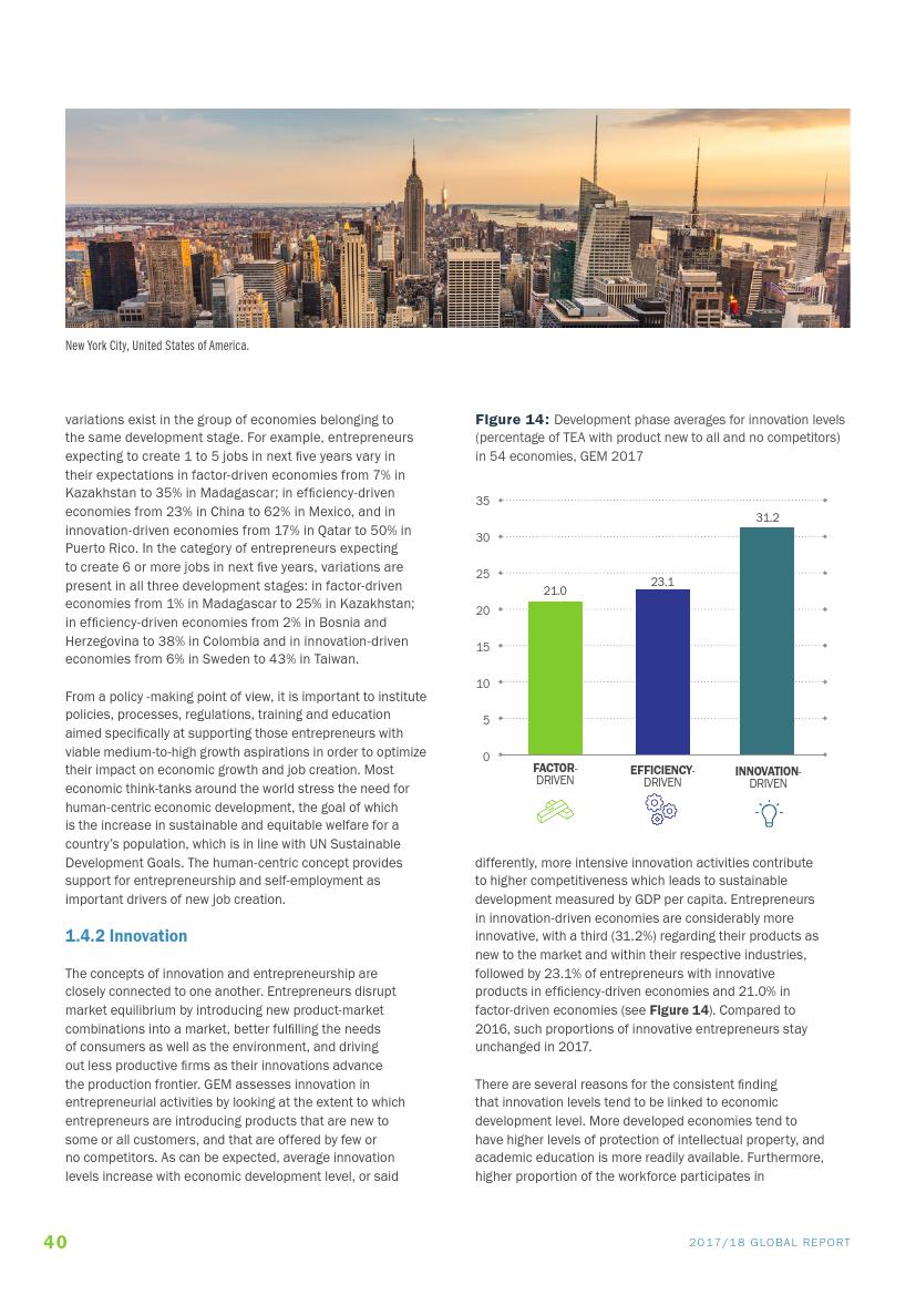 - 在发展中经济体,女性迫于生计创业的比例比男性高出28%。而在创新型经济体中,女性创业参与度最低,他们迫于生计创业的可能性平均仅比男性高19%。