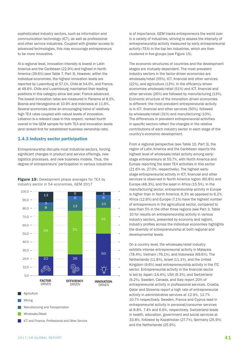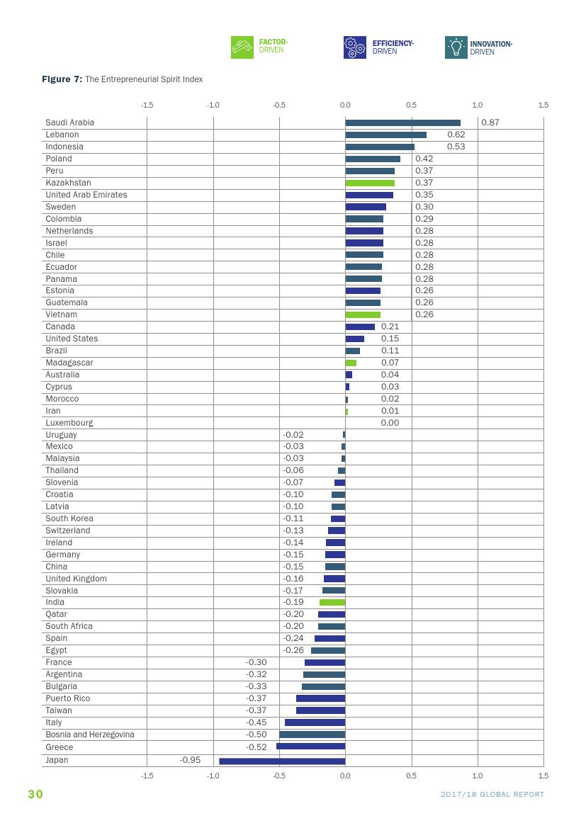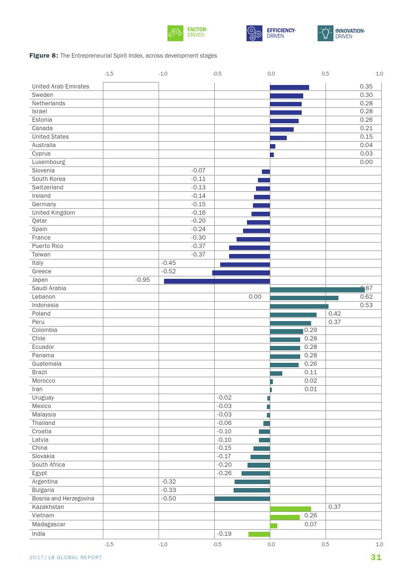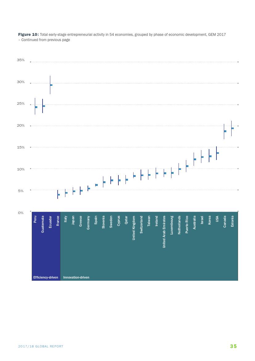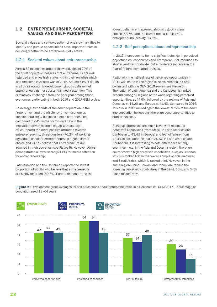 - 在发展中经济体,女性迫于生计创业的比例比男性高出28%。而在创新型经济体中,女性创业参与度最低,他们迫于生计创业的可能性平均仅比男性高19%。