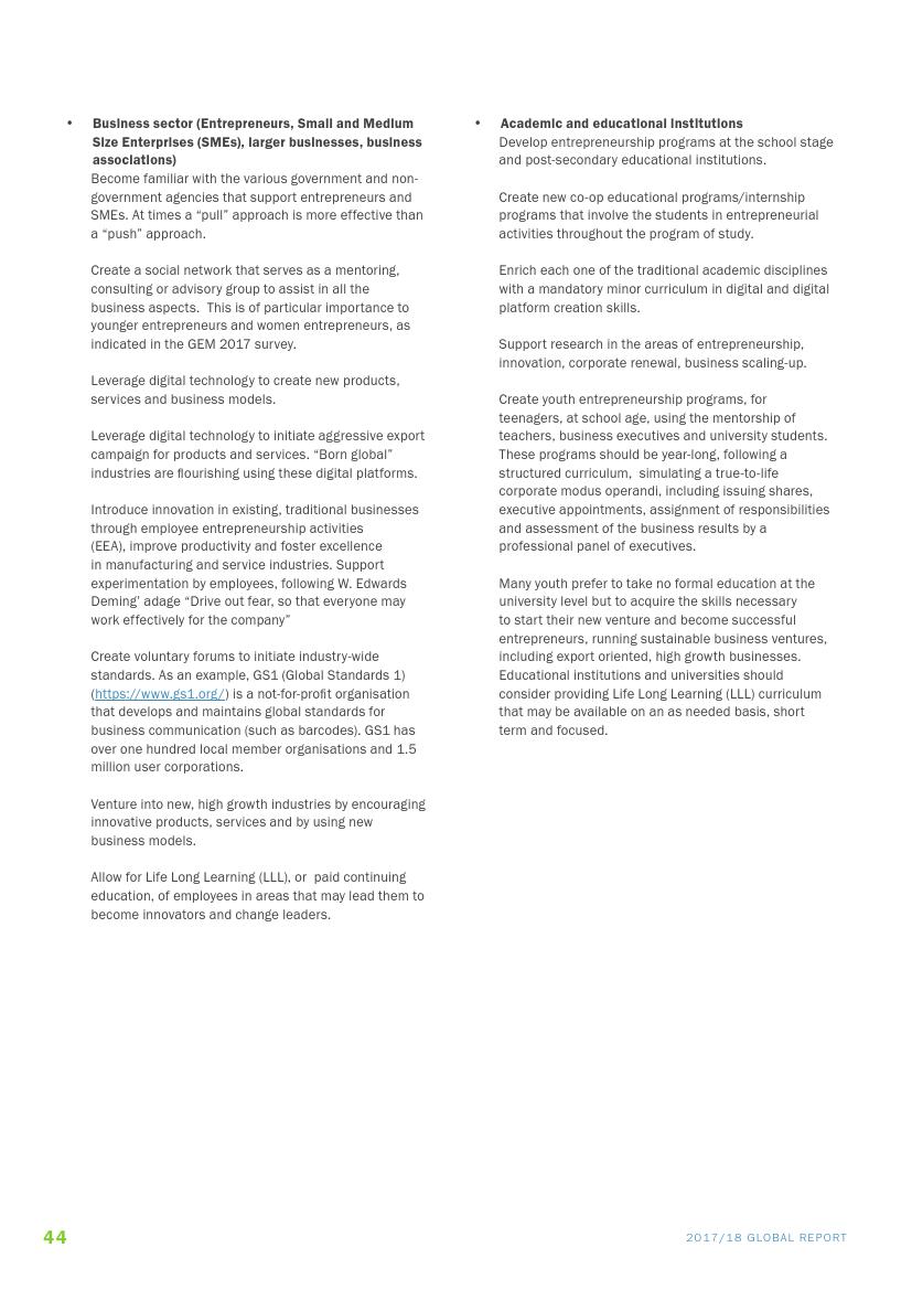 GEM 2017/18报告中旨在改善女性创业的政策建议包括,需要建立更多的社会和支持网络,作为辅导、顾问或咨询小组,为女性企业家提供支持,并努力改变可能妨碍某些区域女企业家创业的陈旧观念。