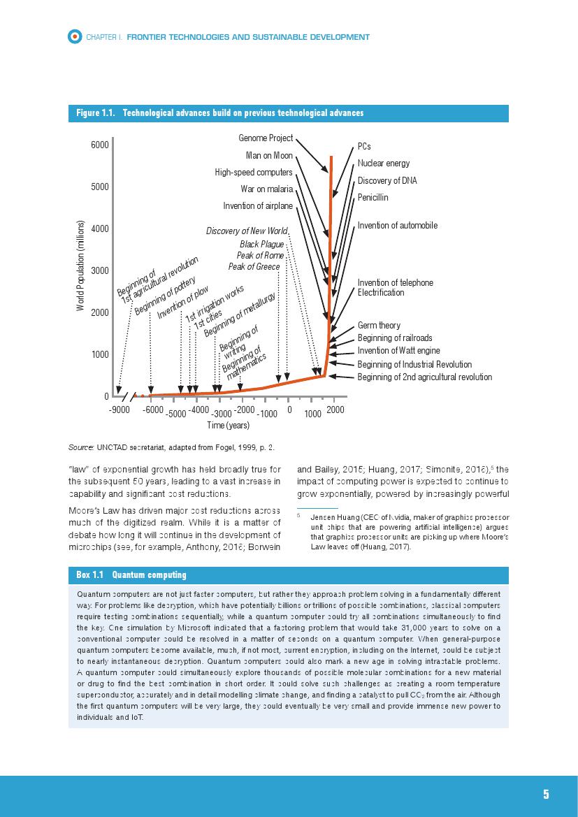 技术的发展和应用速度呈指数级增长。英特尔联合创始人戈登·摩尔在1965年预言微晶片的处理能力每过18~24个月就会增长一倍。这一指数级增长定律在随后的50年中被证明是普遍正确的,同时推动了大部分数字化领域的主要成本降低。随着运算法则(软件)、云计算、机器学习和深度学习、新型微处理机以及量子计算的逐渐强大,预计计算能力还将继续以指数级速度增长。