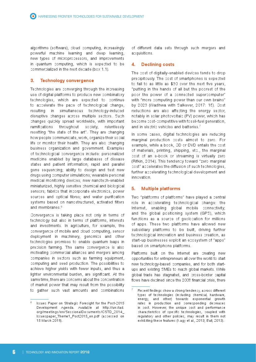 技术正在通过数字平台的广泛使用而产生越来越多新的组合技术,这将继续加快技术革新的速度,给多个领域带来颠覆性变革。这种变革迅速在全世界范围内蔓延,不仅改变着人们的社交、工作、生活以及健康管理方式,还改变了企业和政府管理模式。技术融合的例子包括:由记录疾病状态和患者信息的大型数据库支持实现的个性化医疗;快速平行的基因测序;使用计算机模拟设计和测试新药;可穿戴式个人医疗监控设备;依托于新型纳米技术的小型化、高灵敏度的化学和生物传感器;融合电子元件、电源和光导纤维的纺织物等。融合不仅发生在技术层面,还发生在平台、利益和投资层面。例如,在农业上将移动互联网、云计算、农业机械传感器、基因组测序等技术深度融合,有望实现精准农业的重大突破。