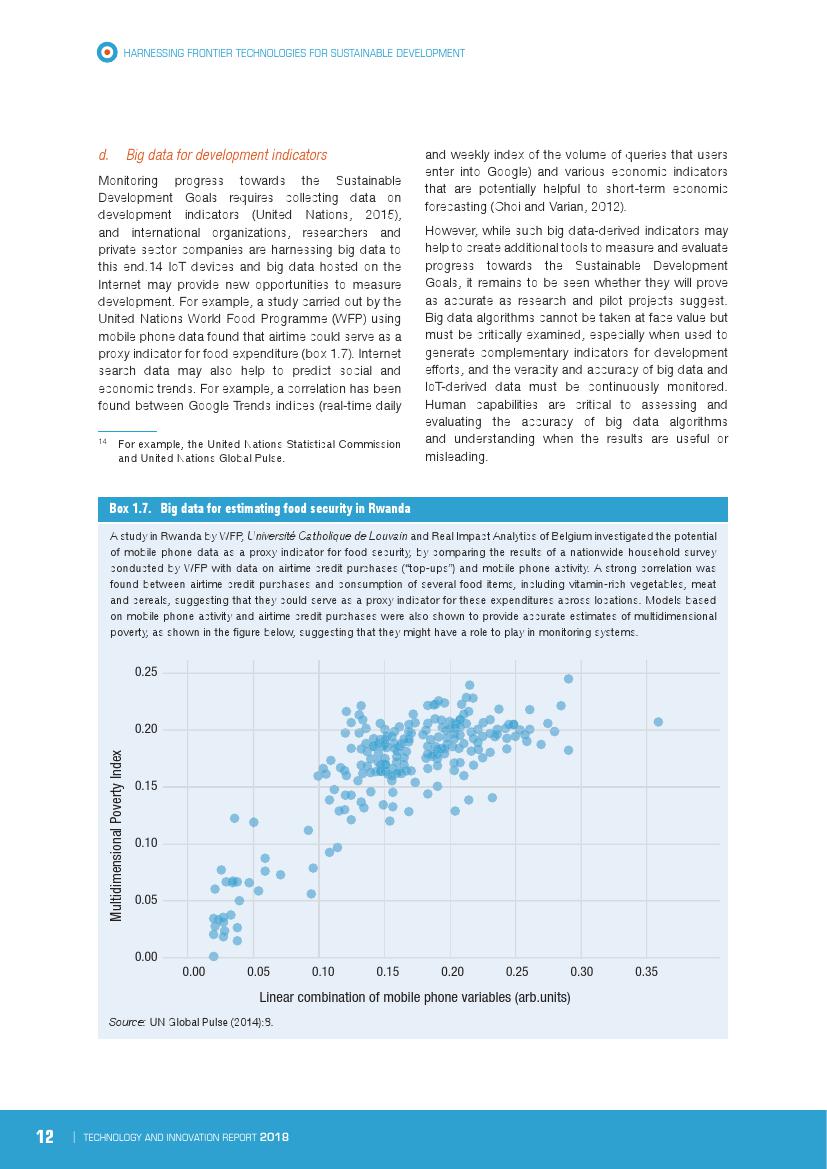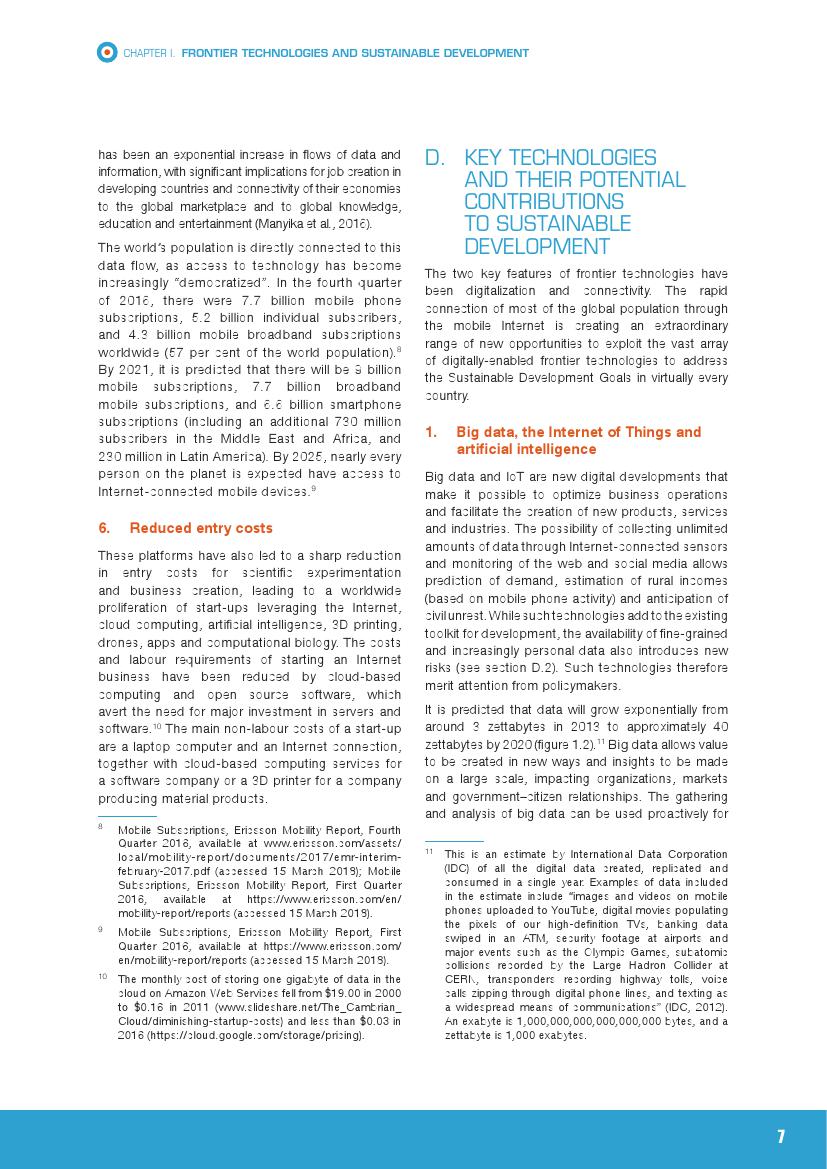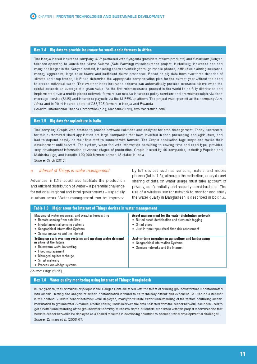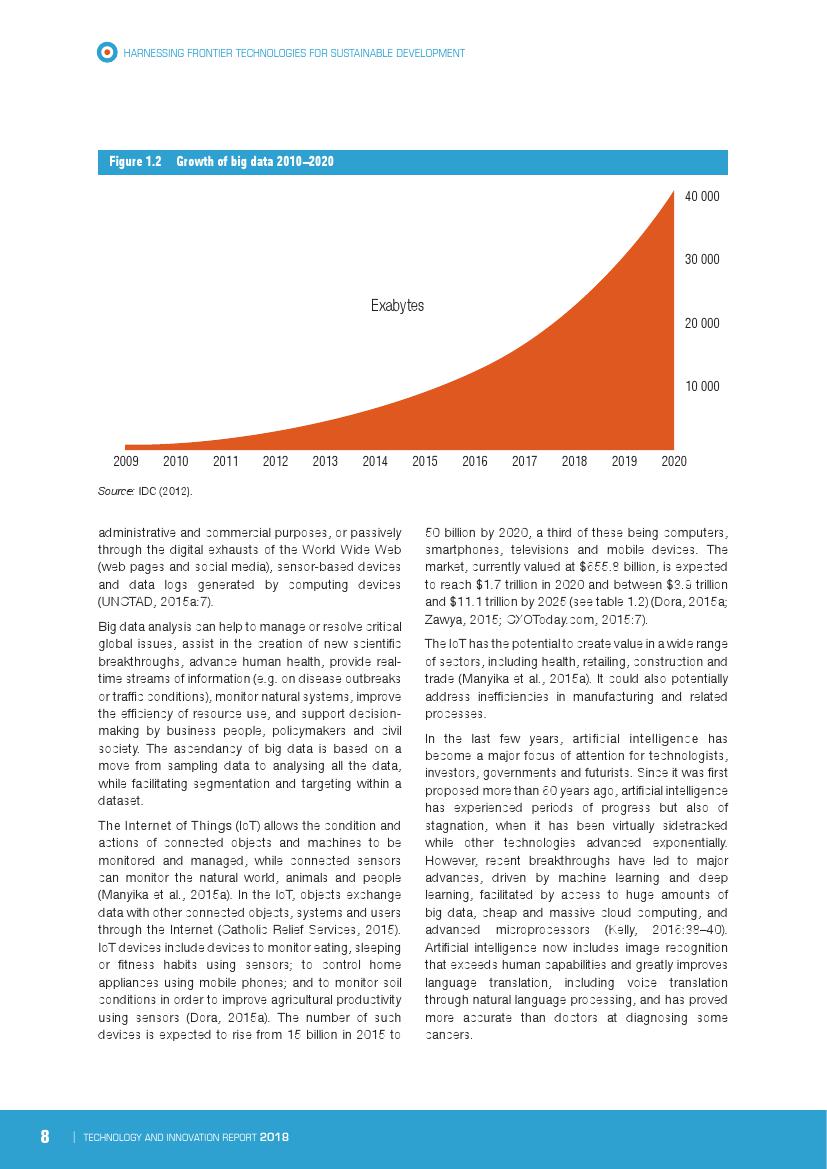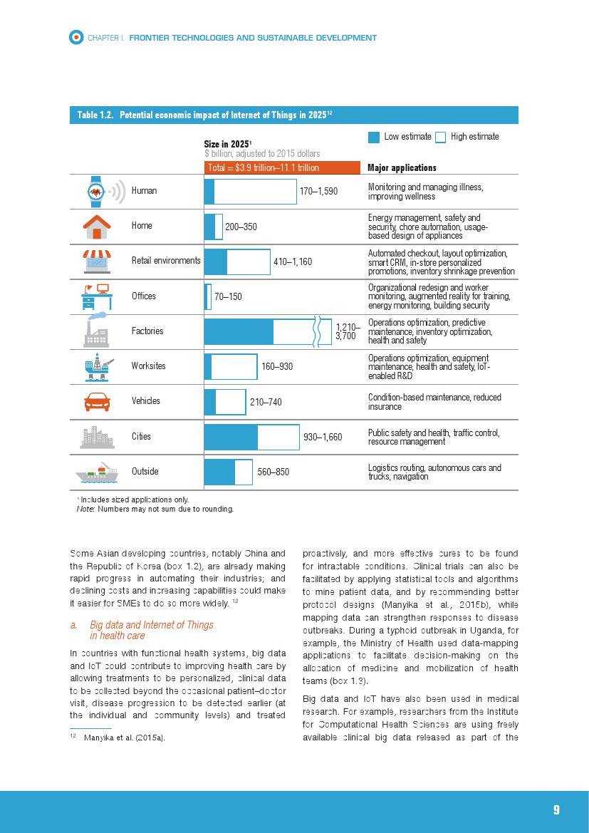 通过与互联网相连的传感器收集海量数据、监控网络和社会媒体,能够预测需求、估测农村收入(基于移动电话活动)以及预测民间动乱。预计到2020年,数据量将从2013年的3ZB(zettabytes)增长到约40ZB。大数据以新的形式创造价值,并能够从更大规模和层面影响组织、市场和政府-公民关系。通过对大数据的收集和分析,能够对组织管理和商业模式进行预见、应对或解决重大全球问题、协助科学新突破、推进人类健康、提供实时信息流(如疾病爆发或交通状况)、监测自然生态系统、提供资源利用效率等。最终为企业负责人、政策制定者和公民社会的决策制定提供支持。