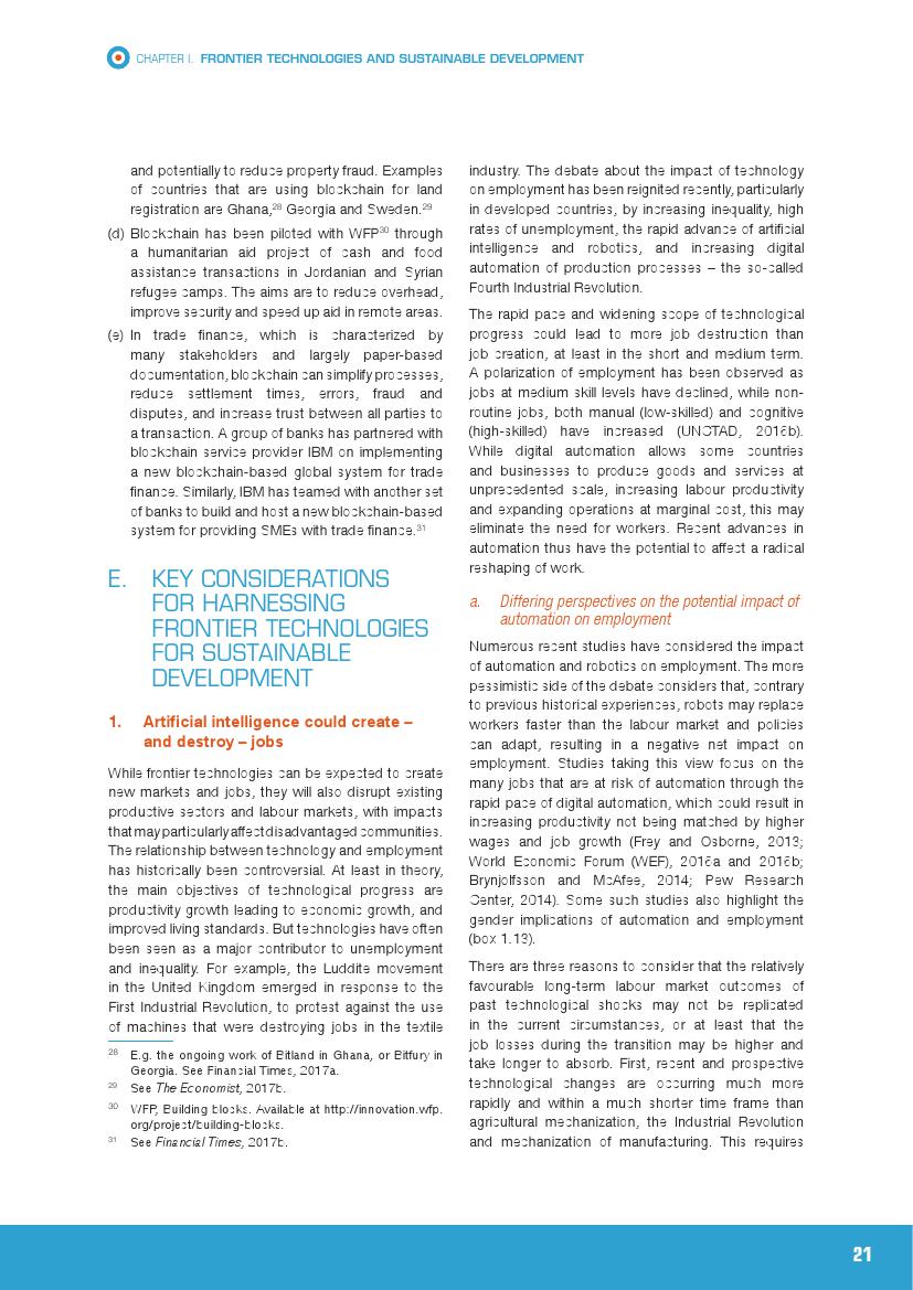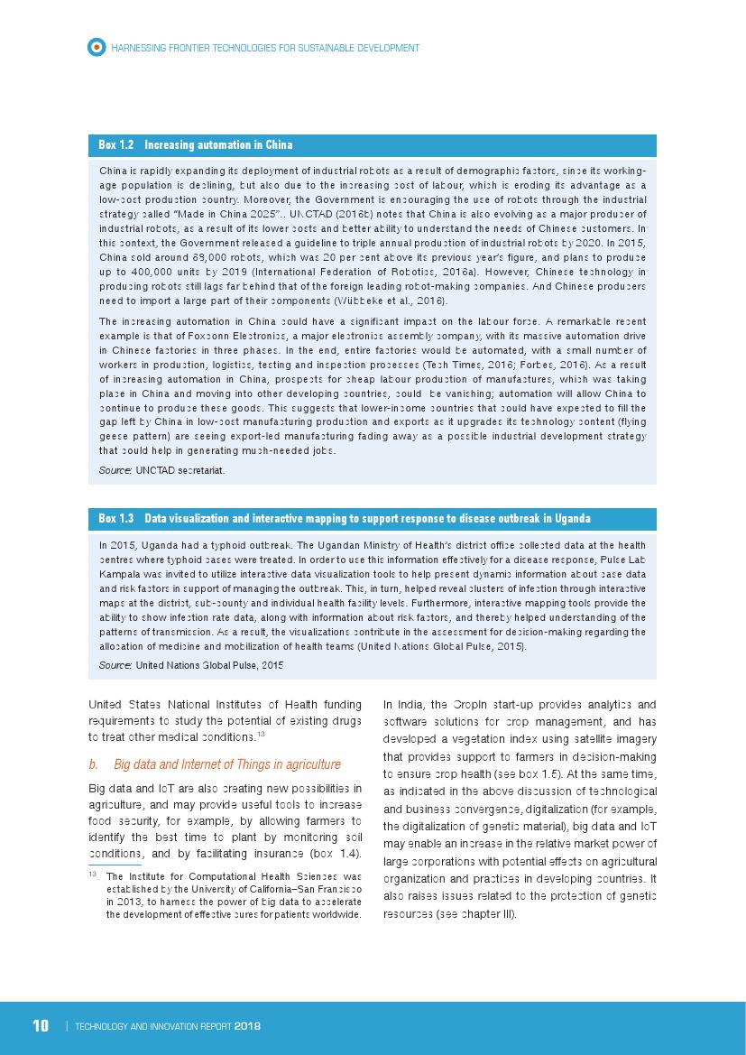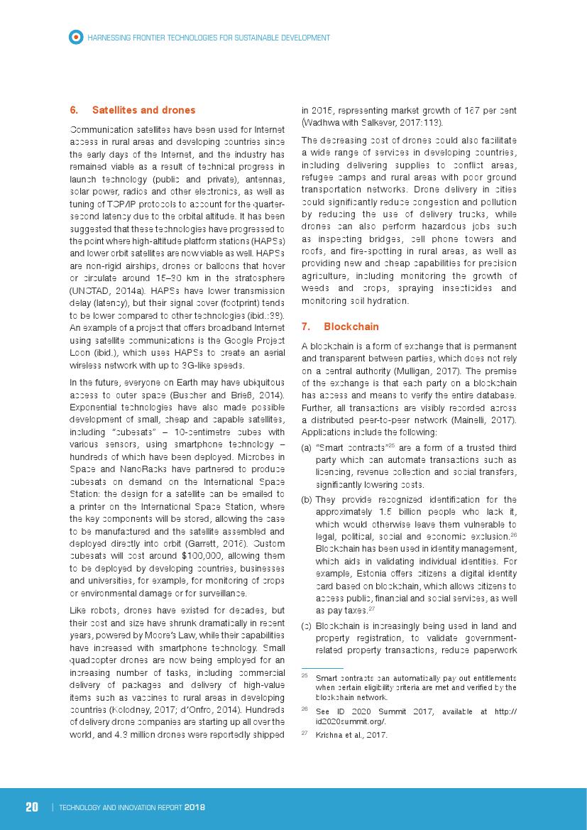 无人驾驶飞机已问世数十年,在摩尔定律的推动下,其成本和体积近年来都有了大幅下降,同时其功能随着智能手机技术的发展得到了增强。如今,小型四翼无人驾驶飞机被用来执行越来越多的任务,如包裹的商用投递、疫苗等高价值物品在发展中国家农村地区的投递等。数百家无人驾驶飞机投递公司正在全世界兴起,2015年有430万架无人驾驶飞机执行了运输任务,相当于167%的市场增长。无人驾驶飞机的成本逐步下降也有利于在发展中国家开展一系列服务,如向冲突地区、难民营和地面交通状况不好的农村地区运送补给。城市中的无人驾驶飞机运输能够大大减少交通拥堵和污染。无人驾驶飞机能够执行检查桥梁、手机发射塔和屋顶以及查看火情等危险任务,还能够为精准农业提供廉价的新型功能服务,如监控杂草和作物的生长、喷洒杀虫剂和监控土壤水化作用。