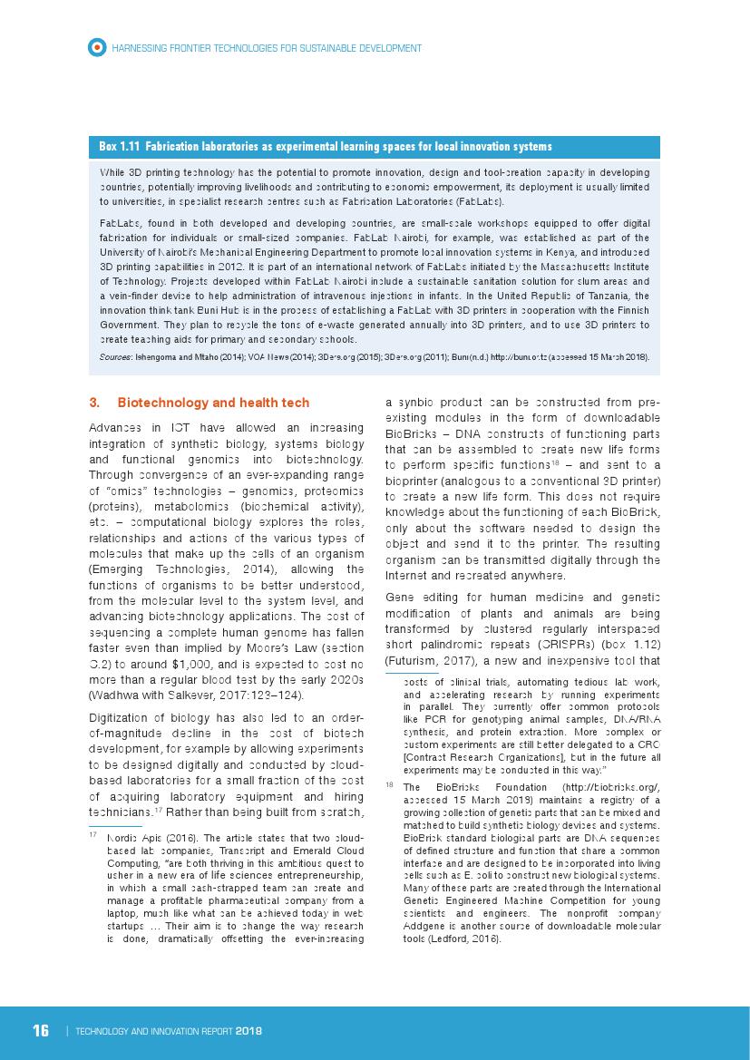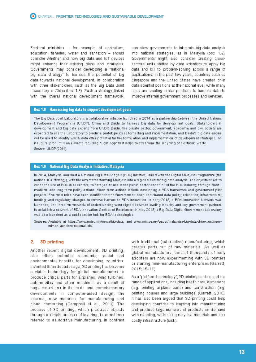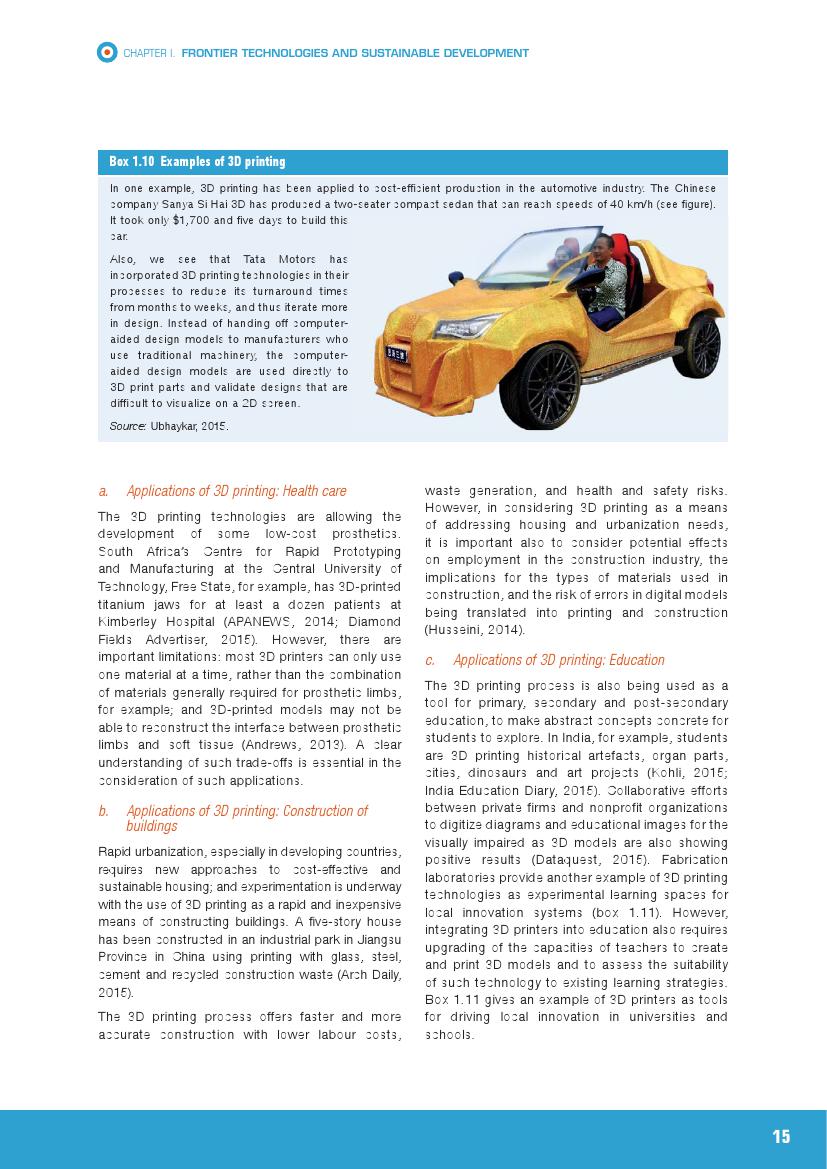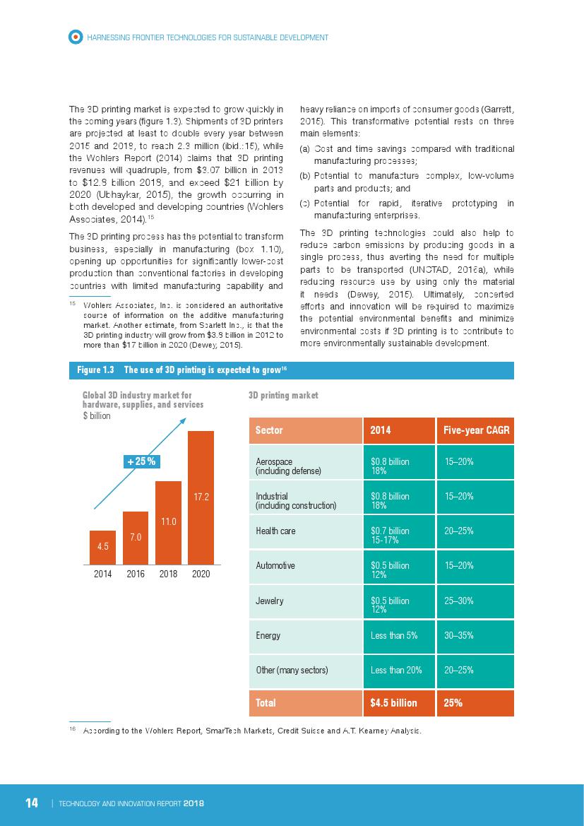3D打印技术为发展中国家带来潜在的经济、社会和环境效益。由于3D打印成本大幅下降,再加上计算机辅助设计、互联网、新材料和云计算的相应发展,30年前发明的3D打印技术已经成为全球制造商生产飞机、风轮机、汽车和其他机器的可行技术。作为一项“平台技术”,3D打印应用广泛,如卫生保健、航空航天(如打印飞机零部件)和建筑(如打印房屋和大型建筑)。3D打印具有改造企业(尤其是制造业)的潜力,为制造能力有限且生活消费品严重依赖进口的发展中国家发展低于传统工厂生产成本的制造业打开了机遇之门。3D打印技术只需要产品原材料,且通过单一工序生产商品,避免了各种零部件的运输,减少了资源的使用,因此还有助于减少碳排放。