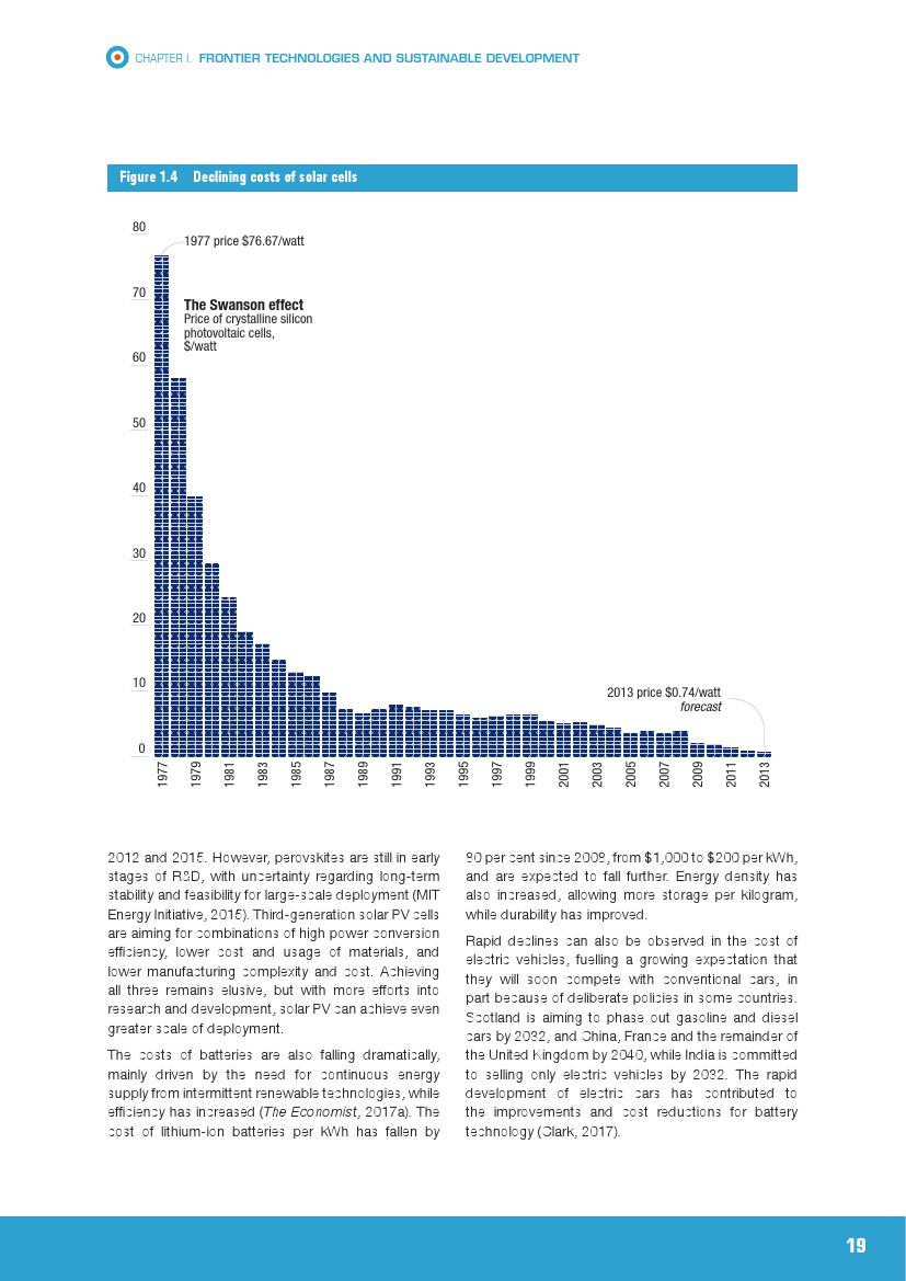 智能手机的成本在未来五年预计要下跌至少30美元,数字设备的成本普遍下跌迅速。成本下跌同时也在影响着能源领域,当前太阳能光伏发电(PV)已经在电动汽车和电池上成为矿物燃料成本的有力竞争对手。在某些情况下,数字技术正在将边际生产成本降至为零,例如,书本、CD或DVD需要材料、运送、印刷等成本,而电子书的边际成本就几乎为零。“零边际成本”的趋势加速了这类技术的扩散,进一步加快了技术开发和创新。