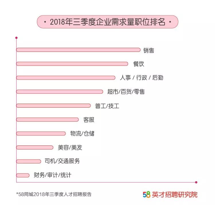 58英才招聘研究院数据显示,三季度,企业需求量排名靠前的职位是销售、餐饮、人事行政等工作。这是由于第三季度的大部分时间处于暑假、中秋节、国庆节等节假日期间,外出吃饭、购物、游玩的人数增多,这也导致服务业需求量增大,因此企业对相关服务业职位的需求量也增多。