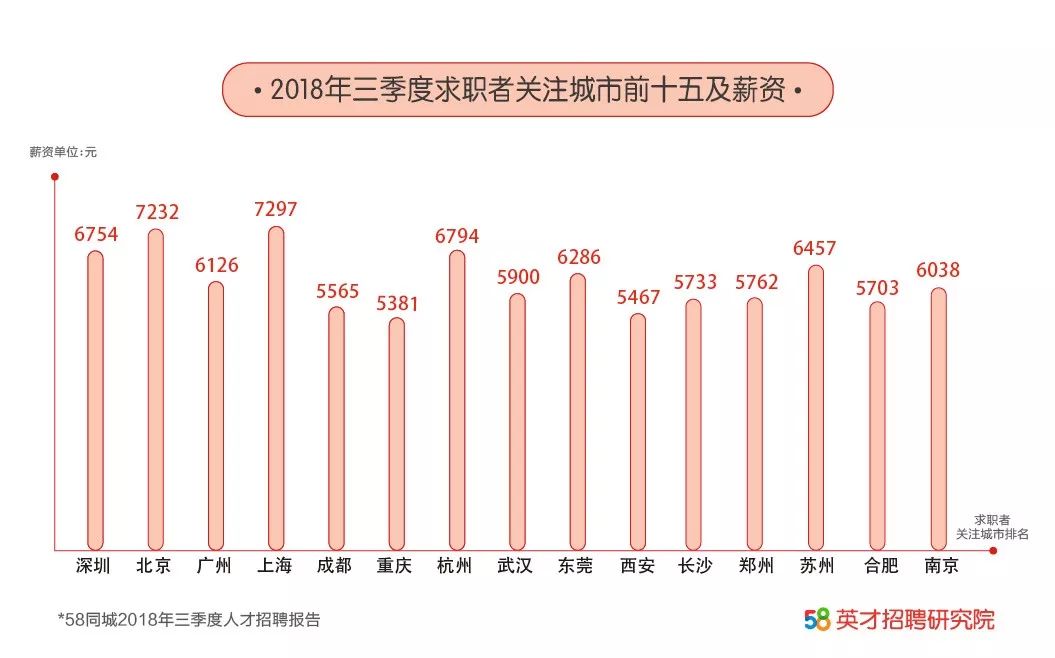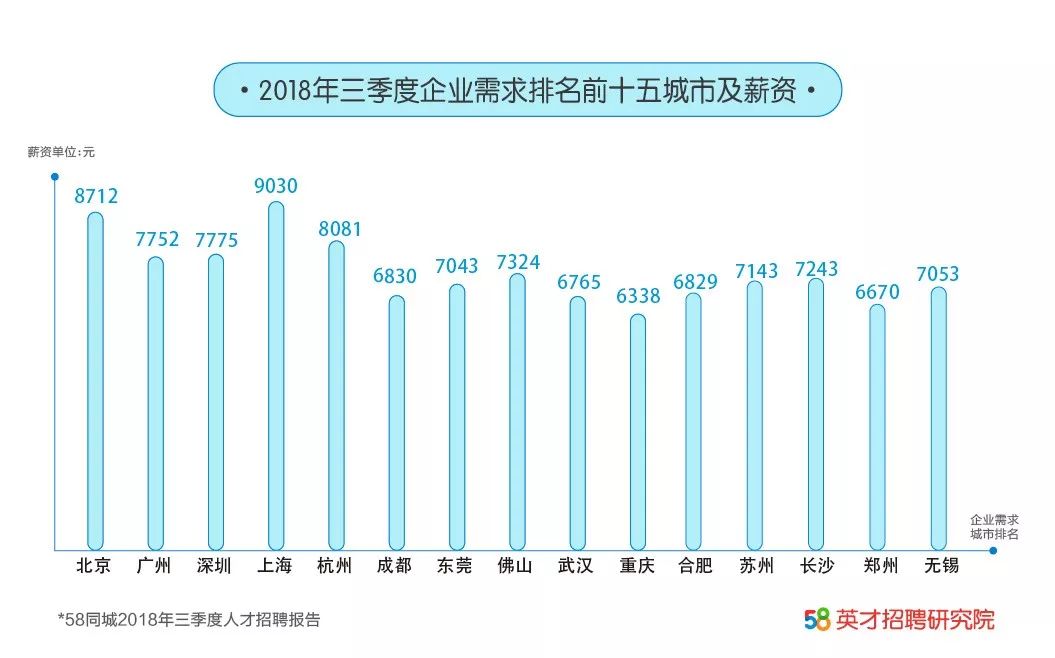 每年7-9月份适逢毕业季与服务行业用工高峰,人才流动较为频繁。作为国民招聘大平台,58同城旗下58英才招聘研究院针对三季度人才流动进行了研究并发布《2018年三季度人才流动报告》,据报告显示,北上广深等一线城市企业招聘需求排名前四,华南和华东区域人才需求旺盛。与此同时,上海企业给出的平均月薪达到9030元,居全国首位,其次是北京和杭州,分别为8712元和8081元。求职者最关注的就业城市仍然是一线城市,其中深圳排名第一,其次是北京、广州和上海。