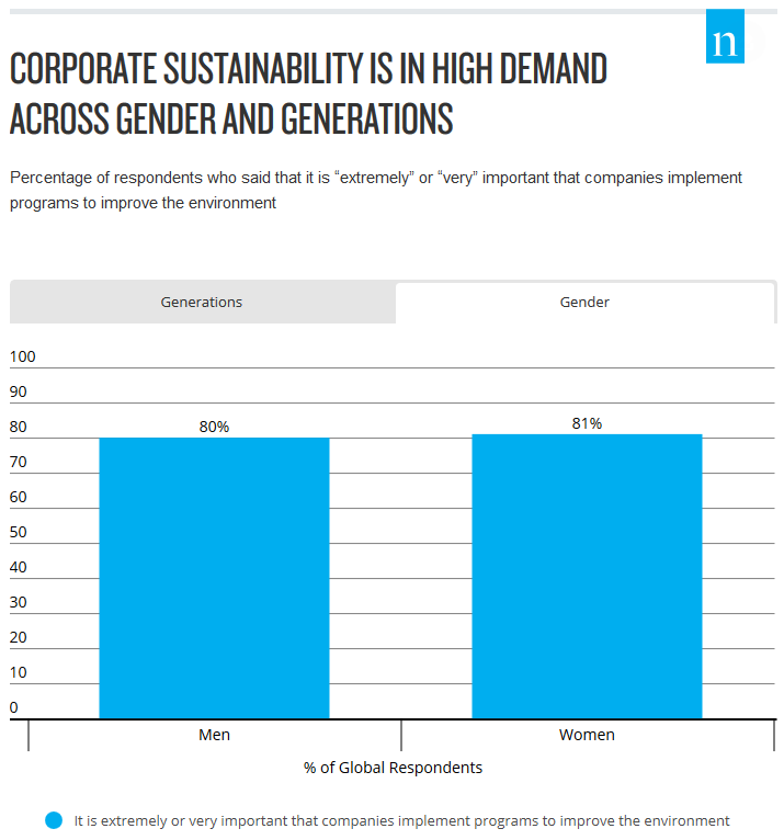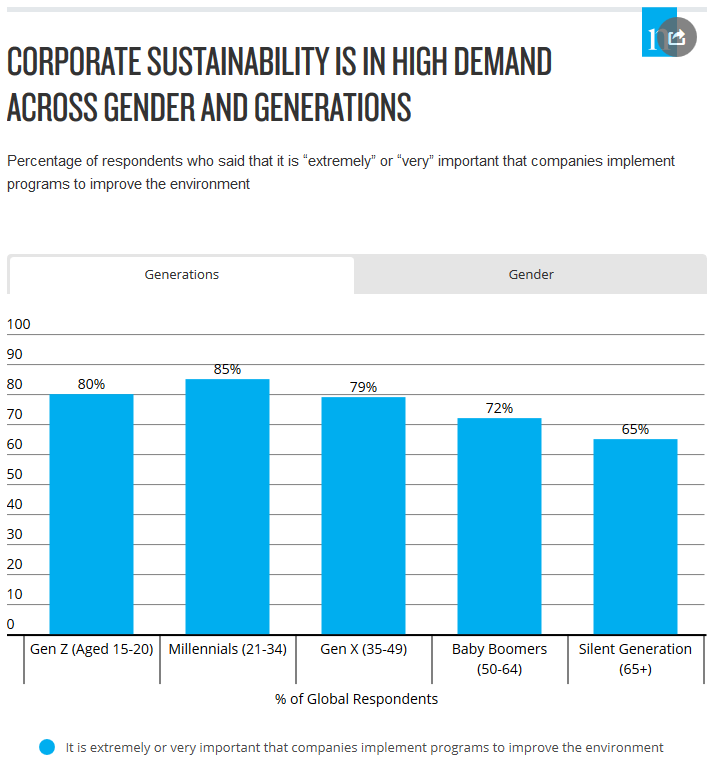 81%的全球受访者强烈认为企业应该帮助改善环境。这种对企业社会责任的热情在性别和世代之间十分相似。千禧一代、Z世代和X世代是最支持的,但老一辈人也不甘落后。