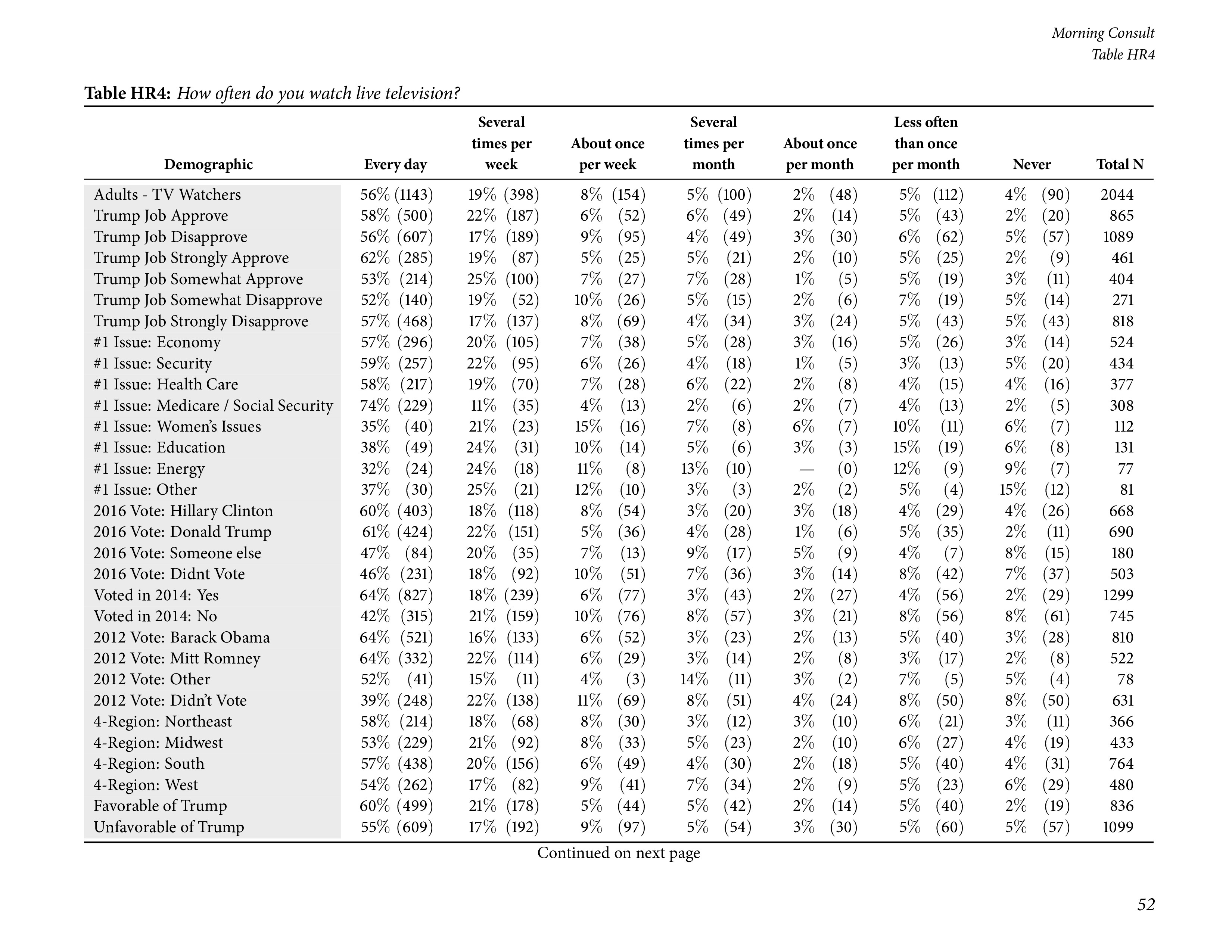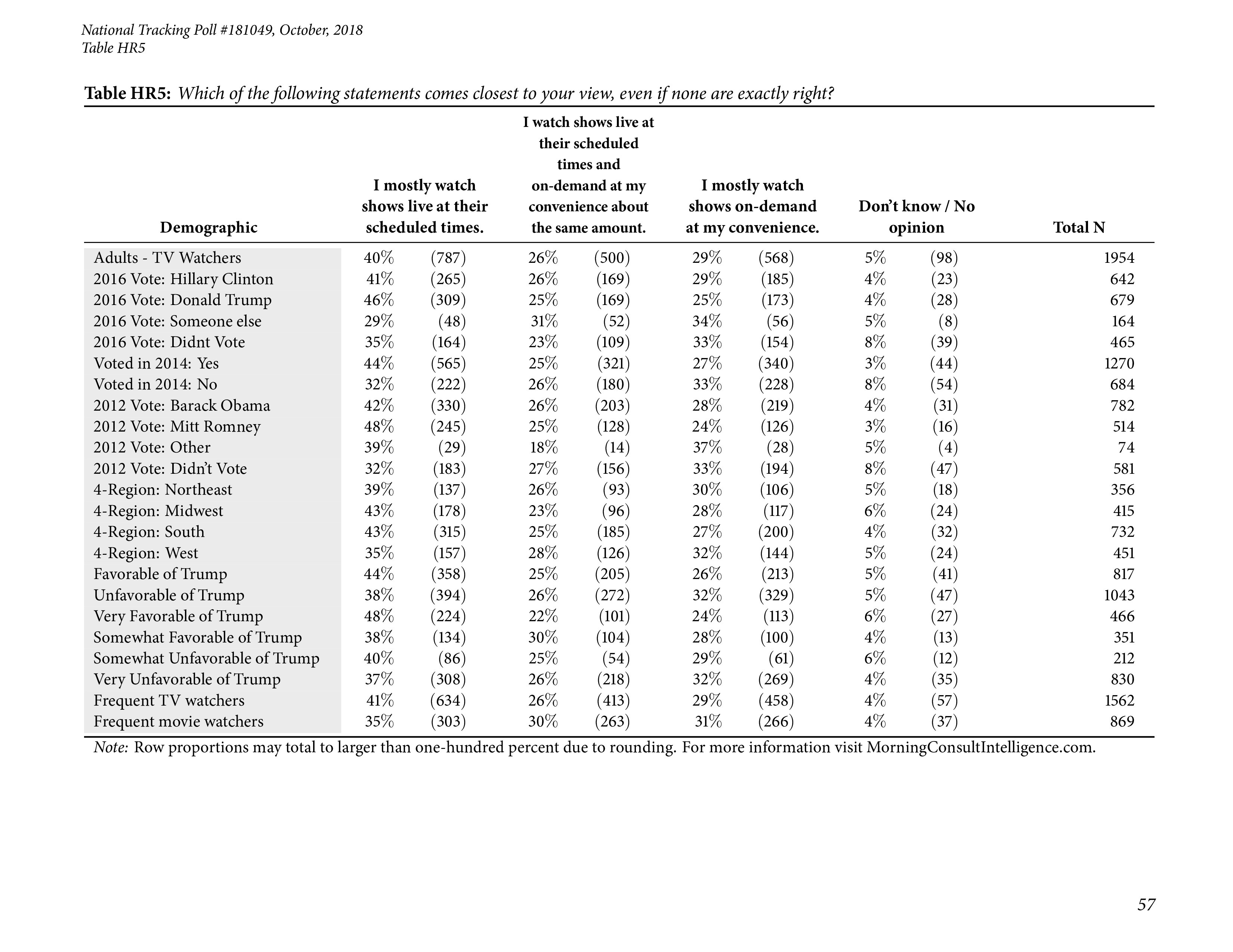 为了看更多电视,观众都会做一些个人牺牲,86%的受访者为了看秀比平时睡得晚,52%的受访者会整晚看电视。近1/4的电视观众为看电视取消了社交约会(24%),这个数字在年轻人中上升为45%。40%的电视观众因为狂看片而减少健康食物或锻炼,57%的年轻人这么做。