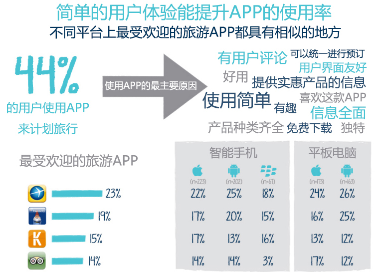 智能手机版本和平板电脑版本的Expedia APP在所有应用中最受到用户的欢迎,因为其工具“易于使用”并具备“用户友好型界面”(注:上述调查报告由Expedia所赞助。)