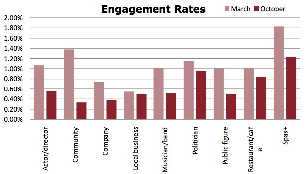 在Facebook上不同类型的品牌帐号中,社团主页的低活跃率最高(79.3%),然后是公司主页(73.5%)。名人主页的平均粉丝数量则从3月份的9144个增长至10月份的11713个。而企业主页的粉丝则从6407下降至3222.