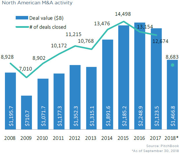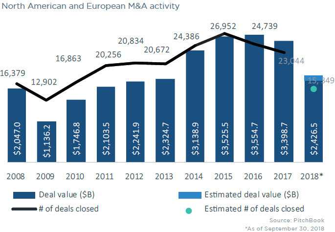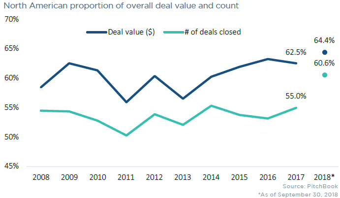 今年到目前为止,北美和欧洲市场已经出现差距,后者的活动有所减少,而前者与前几年保持一致。 2018年,北美占交易价值的64.4%,占两个地区交易数量的60.6%。这两个数字均高于前十年的平均值(60.3%和53.5%)。