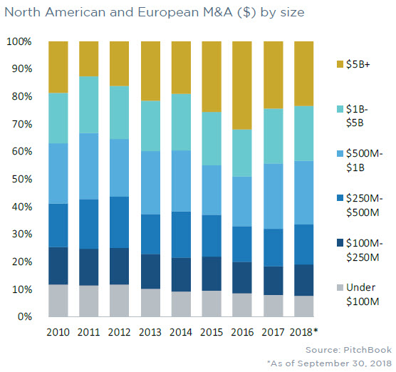 超过1亿美元的交易数量今年继续增长,延续了几年前的趋势。同样,规模较小的交易在总交易价值中的份额也越来越低,到目前为止,交易额低于1亿美元的交易价值份额不到8%。第三季度,这一最小类别占所有交易价值的6.7%,而2017年第三季度为7.6%。