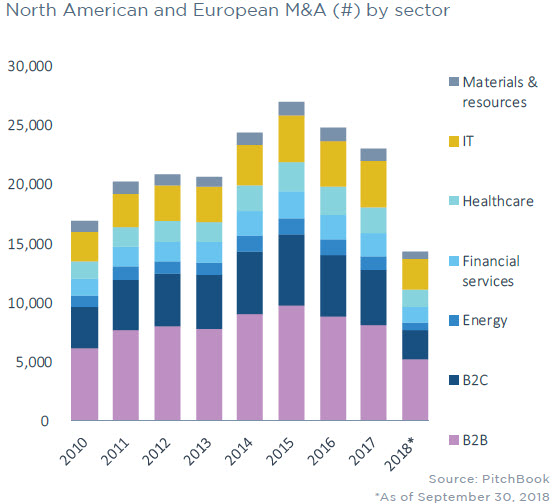 IT部门在2018年的步伐并不像过去几年那样。相比之下,B2C行业的交易数量大幅下降,这使得IT部门(2,600宗)并购交易量首次超过B2C(2,450宗)。