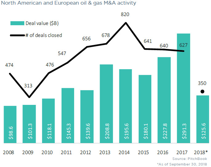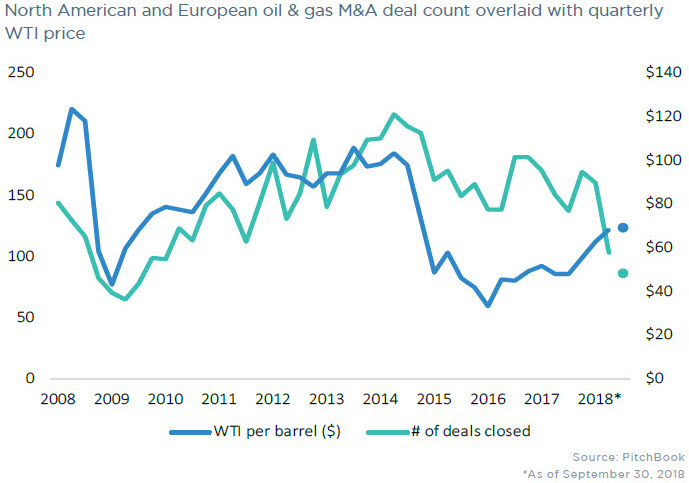 石油价格是石油和天然气行业的主要推动因素。尽管第三季度油价达到2014年第四季度以来的最高点,但交易数量和交易价值与2017年相比都在下降。