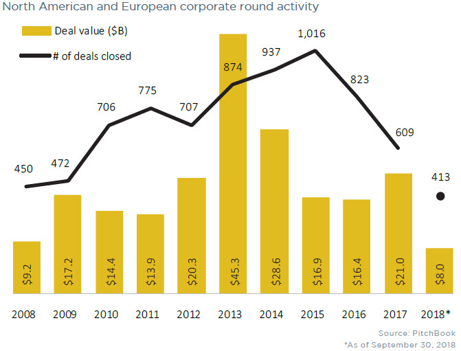 企业轮次,指战略合作伙伴的少数股权投资,通常用于建立可能最终以收购或合并结束的关系。尽管并购交易量和价值保持相当稳定,但在2015年达到高峰,那之后这一数字一直在急剧下降。