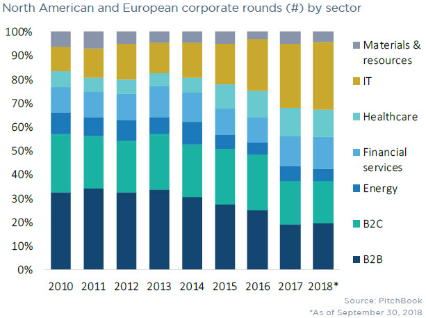 在企业轮次中,IT部门在交易数量方面的增长幅度最大,从2010年的10.1%增加到今年的28.8%。