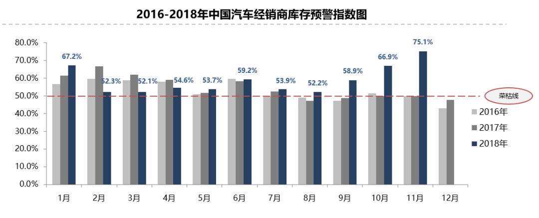 2018年11月30日,中国汽车流通协会发布的最新一期“中国汽车经销商库存预警指数调查”VIA(Vehicle Inventory AlertIndex)显示,11月份汽车经销商库存预警指数为75.1%,环比上升8.2个百分点,同比上升25.32个百分点,库存预警指数位于警戒线之上。