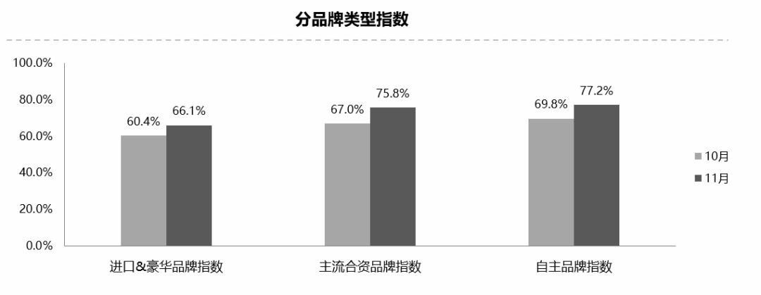 从分品牌类型指数看: 从分品牌类型情况看,2018年11月进口&豪华品牌指数、合资品牌指数、自主品牌指数较上月上升。