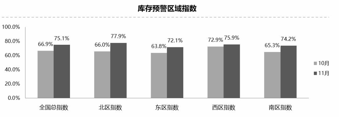 从区域指数情况看:11月份全国总指数为75.1%,北区指数为77.9%,西区指数为75.9%,南区指数为74.2%,东区指数为72.1%。