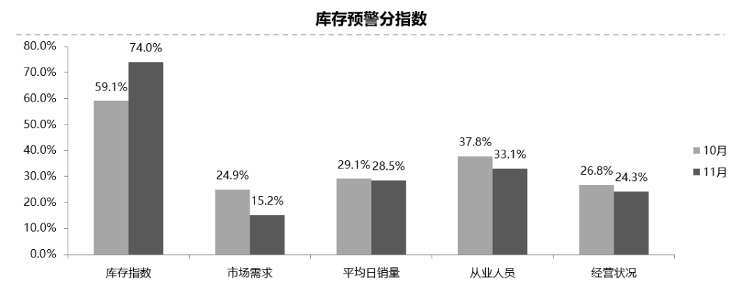 从分指数情况看:库存指数环比上升,市场需求指数、平均日销量指数、从业人员指数、经营状况指数环比下降。