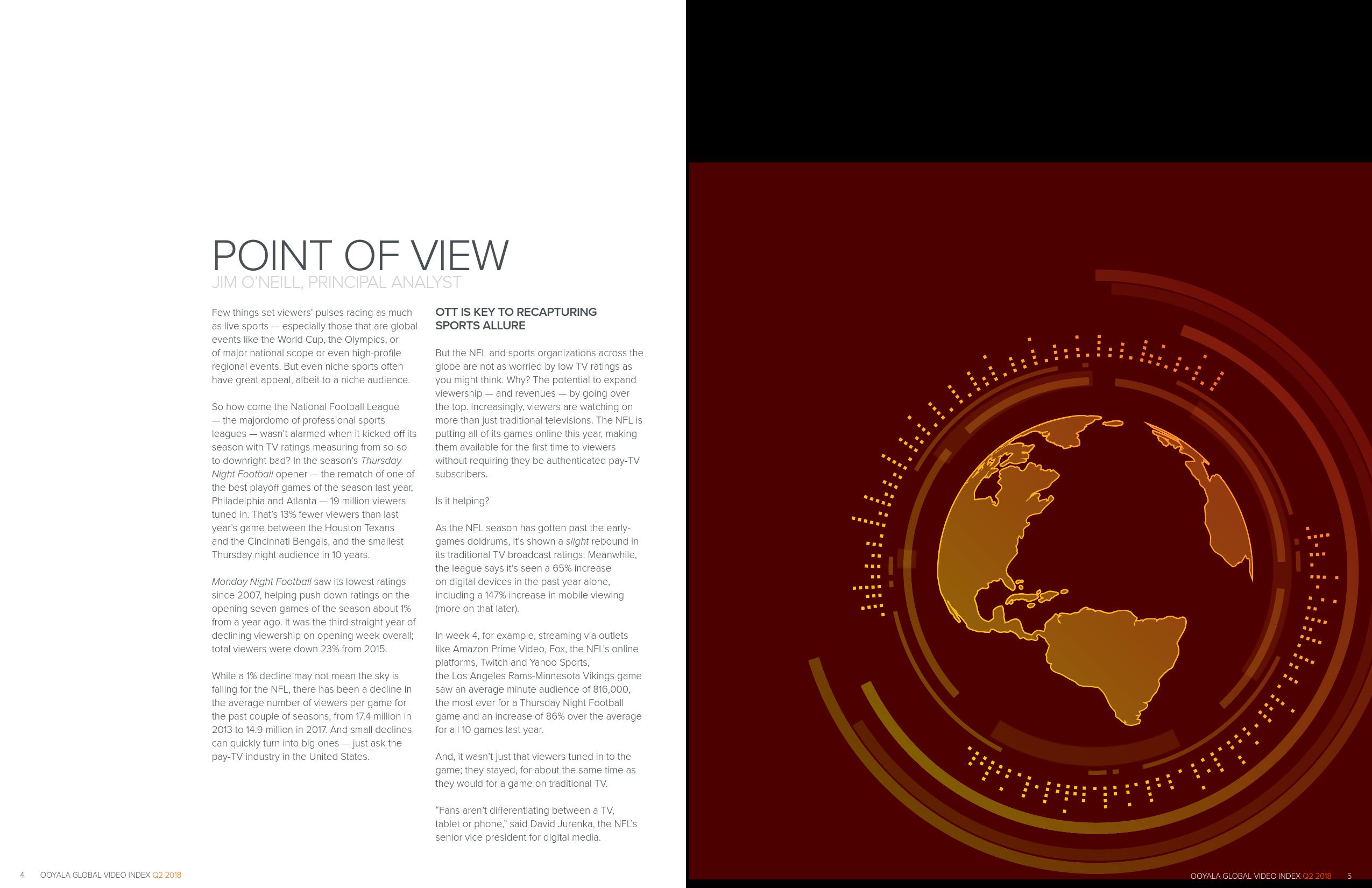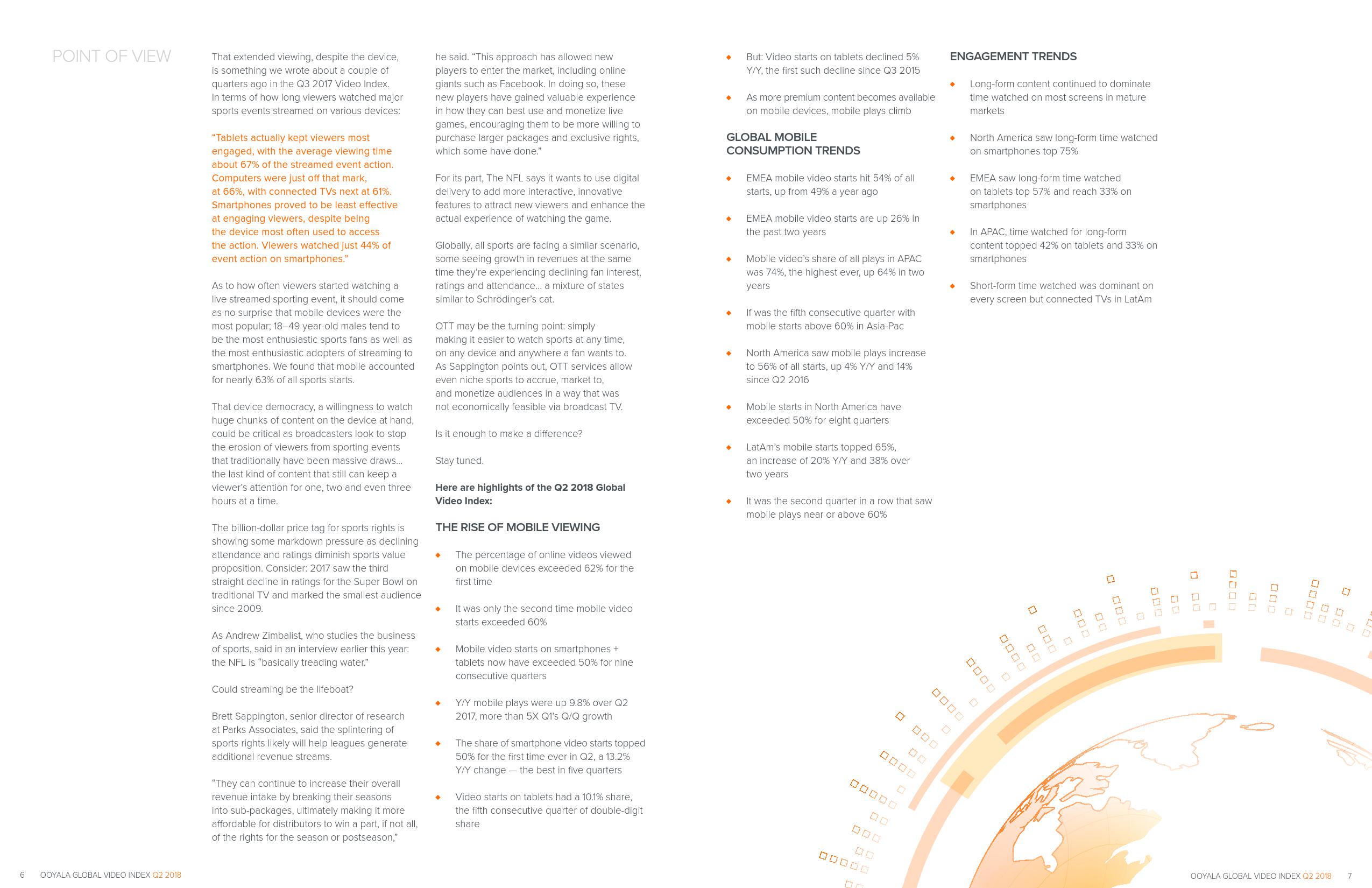 亚太和拉美地区的移动视频播放量增长已令人瞩目,但整体来看,全球各地区的移动视频播放量都呈现增长趋势。越来越多优质内容如体育赛事直播等内容可在移动设备上观看,吸引了更多用户使用移动设备观看视频。过去几年OTT行业飞速变化,但有些特点是保持不变的,尤其是用户的选择心理,他们总是想要方便快捷随时随地在他们选择的设备上观看所有内容。带宽的增加、费用的降低、数据限制的增加或消除以及5G网络时代的最终到来都为移动设备的“电视般”视频观看体验更为可能,也变得更加重要。