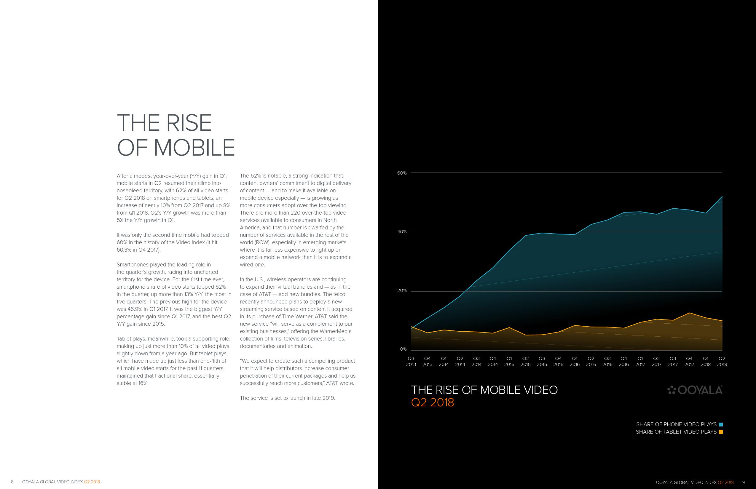 经历了第一季度的年增长表现平平,移动视频在今年第二季度取得了令人瞠目结舌的成绩,移动视频播放量(智能手机和平板设备)占比达到62%,与2017年第二季度相比增长了近10%,与今年第一季度相比也增长了8%。这是移动视频播放量历史上第二次超过60%(第一次是2017年第四季度)。